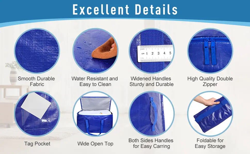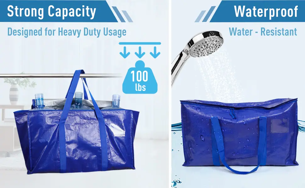 【Característica del producto】Las bolsas de mudanza de gran capacidad cuentan con un diseño de asa envolvente, cierre suave de doble cremallera para almacenamiento a prueba de polvo, y son fuertes, resistentes al desgaste y fáciles de limpiar. Ideal para guardar ropa de temporada para prevenir la humedad y el crecimiento de moho.. El diseño de costura resistente, las asas reforzadas y la construcción antidesgarro garantizan una carga segura y un uso seguro.. El diseño de bolsillo con etiqueta le permite clasificar y marcar sus pertenencias para facilitar el acceso durante la mudanza y el almacenamiento.