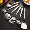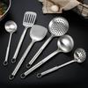 Venta al por mayor, pala de cocina de acero inoxidable 304, mango largo grueso, espátula integrada, cuchara sopera, colador, juego completo de herramientas de cocina para el hogar