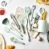 Barril de almacenamiento verde agua transfronterizo con mango de madera, utensilios de cocina de silicona, espátula antiadherente de 11 piezas, utensilios de cocina, traje de cocina