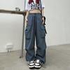 Pantalones deportivos casuales estilo hip hop estilo retro americano para mujer, rectos, holgados, de cintura alta, adelgazantes, con múltiples bolsillos