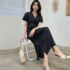 Conjunto de dos piezas de moda de verano con lunares plisado de fábrica que reduce la edad, top con cuello en V y falda recta adelgazante con abertura.
