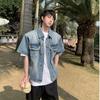 Camisa Jeans Masculina de Manga Curta Estilo Chanel Pequena sem Gola com Ombreiras Sensação de Alta Qualidade Yuppie Bonito Roupa de Trabalho Casaco Estilo Americano High Street Moderno