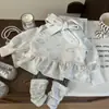 Traje de verano para niñas 2025 Nuevo Elegante Moderno Bebé Verano Cuello de encaje Flor pequeña Manga corta Conjunto de dos piezas para el cabello