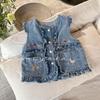 Chaqueta Chaleco para Niñas de Primavera y Otoño, Bebé Elegante, Moda Infantil Tendencia, Chaleco de Mezclilla Bordado con Encaje Coreano
