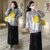 Ropa de Maternidad 2025 Otoño e Invierno Nuevo Engrosado Caricatura Cara Sonriente Suéter Holgado + Botón de Nariz de Cerdo Falda Traje con Efecto Adelgazante