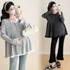Estilo Coreano Otoño/Invierno Nuevo Camiseta de Cuello Redondo Plisada para Mujeres Embarazadas Cubre Barriga de Mamá de Moda Soporte Ajustable Pantalones de Maternidad Conjunto de Dos Piezas para el Trabajo