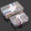Caja con alfileres de plástico de colores, alfileres nacarados, alfileres para marcar mapas, chinchetas, bolas redondas, alfileres cortos y alfileres de fijación de corcho.