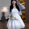 Talla grande mm vestido dulce de tirantes espagueti cárdigan adelgazante conjunto de dos piezas línea A encaje patchwork ceñido a la cintura conjunto fresco