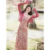 Vestido de Encaje Floral con Tirantes, Estilo Chino Otoñal, Tallas Grandes, Cintura Ajustada, Vestido Largo con Chaqueta Cárdigan, Conjunto de Dos Piezas, Moderno