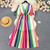 Estilo Vacaciones en la Playa Vestido de Playa para Mujer Verano Gama Alta Nicho Combinación de Colores Dulce Mangas Abullonadas Cuello Vestido Largo Colorido