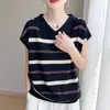 Camisa de Manga Corta de Seda de Hielo Estilo Nuevo 2025 para Mujer Verano Rayas Cubre Vientre Temperamento Camisa de Punto Top Tendencia