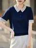 Suéter de lana peinada, primavera-verano 2024. Top de cuello polo para mujer. Top de manga corta con contraste de estilo extranjero.
