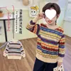 Cárdigan de punto con rayas de contraste estilo coreano para niños, otoño e invierno, suéter grueso y cálido para niños, chaqueta con cuello alto para niñas, moderna