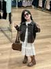 Chicas Otoño 2024 Abrigo de Cuero Vintage Traje de Falda Dulce de Pastel Ropa Base con Mangas Largas y Lazo Moderno