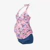 Traje de baño de maternidad de dos piezas con cuello halter y lazo, estilo europeo y americano, talla grande, estampado multicolor de Amazon, alta elasticidad y comodidad.