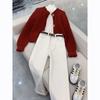 Shanli Dadi Otoño Ropa Suave Mujer Nuevo Cárdigan de Punto Coreano Camisa Base Pantalones de Pierna Ancha de Cintura Alta Tres Piezas
