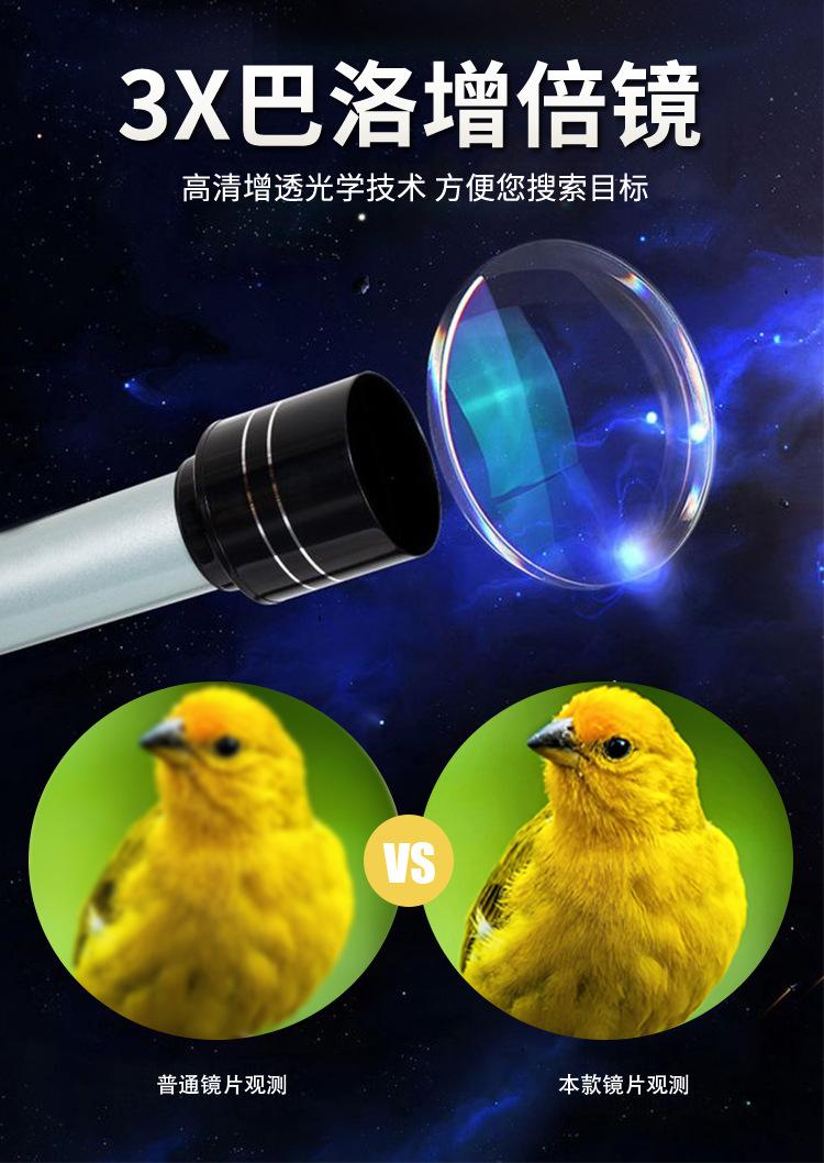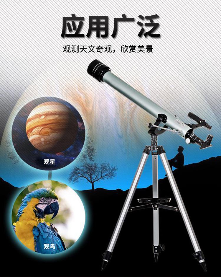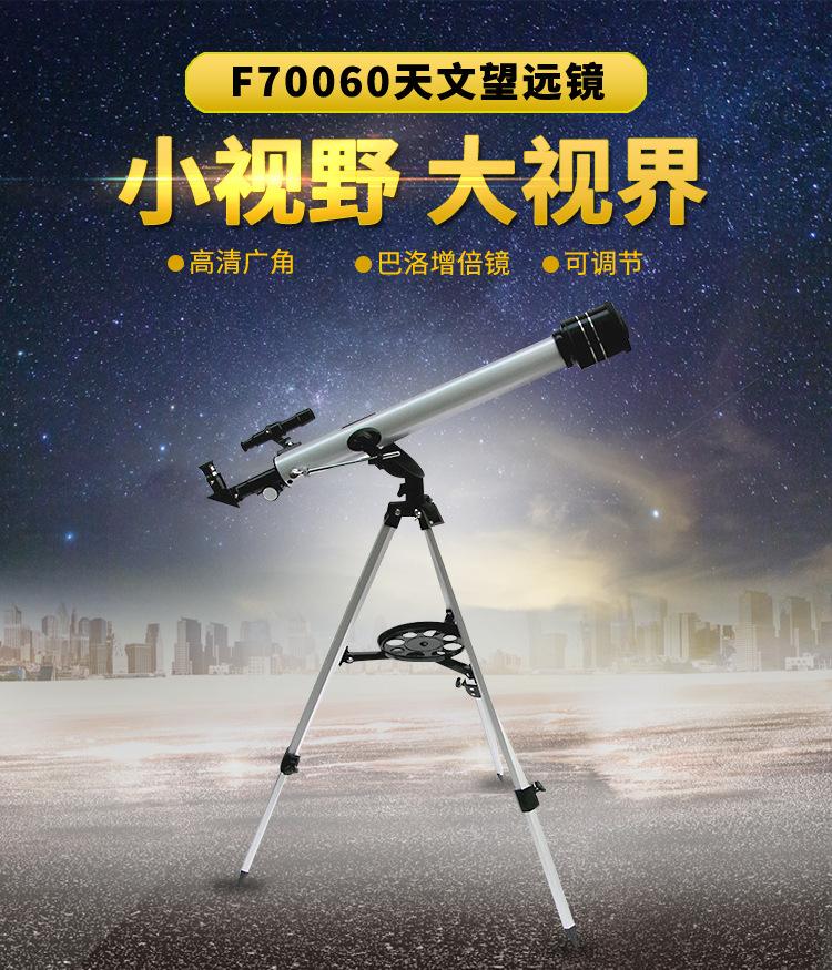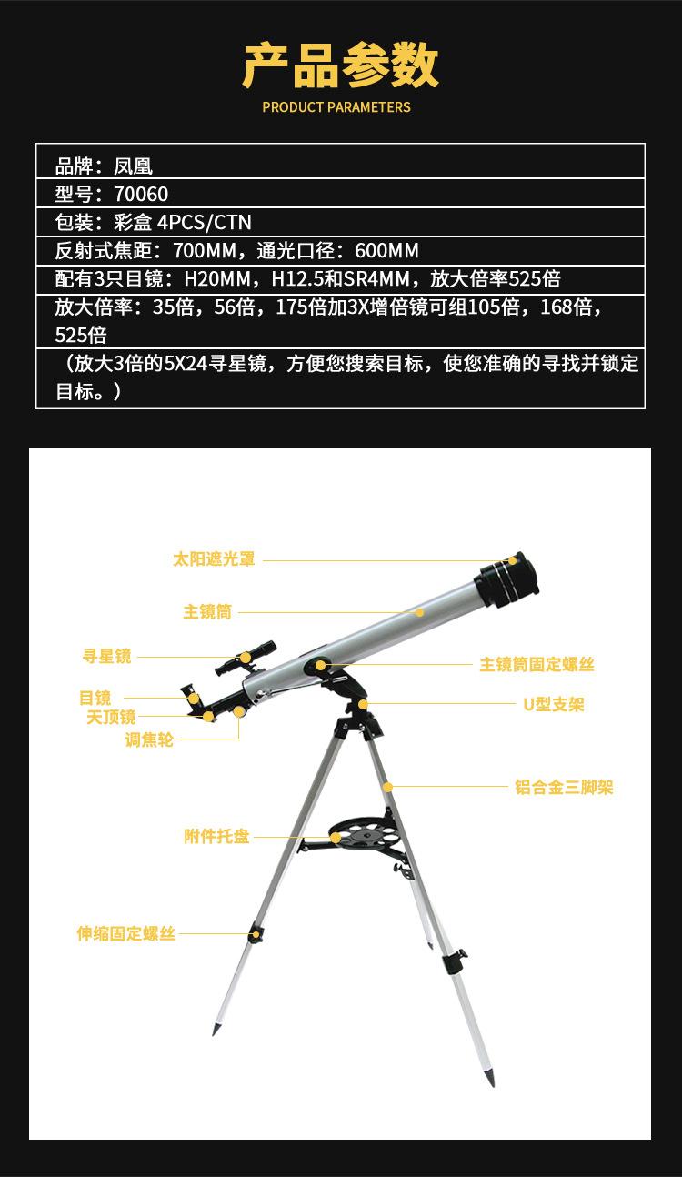 Distância focal refratora: 700mm, abertura: 60mm Equipado com 3 oculares: H20mm, H12.5 e SR4MM, magnificação 525x Ocular invertidora 1.5x e lente Barlow 3x