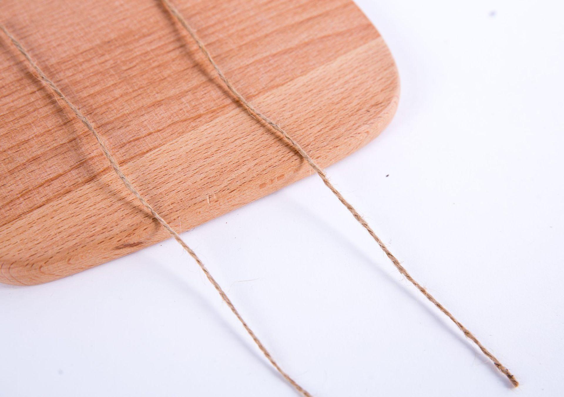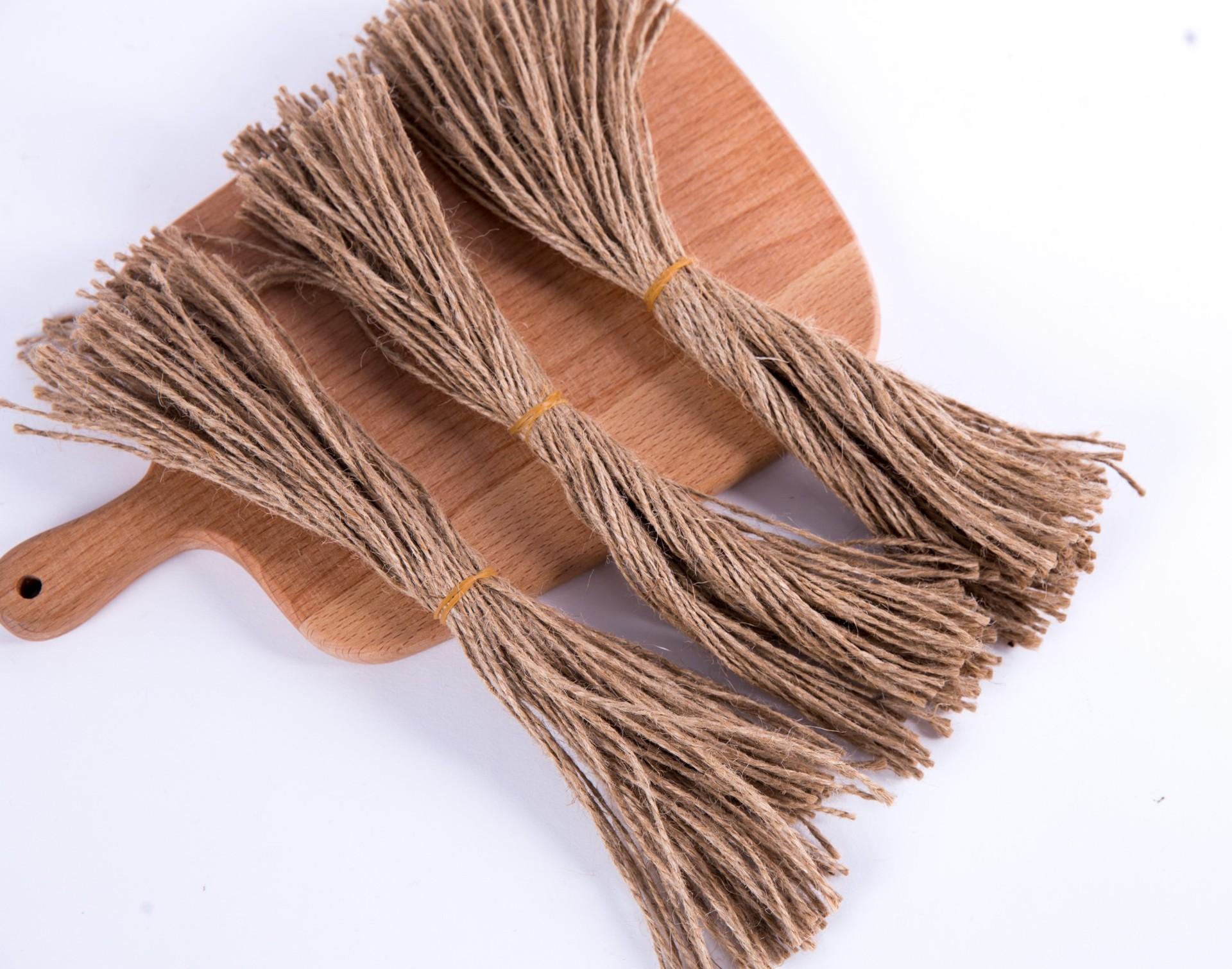 Esta cuerda de cáñamo mide aproximadamente 1.5 mm de diámetro y 25 cm de largo. Se corta a mano.