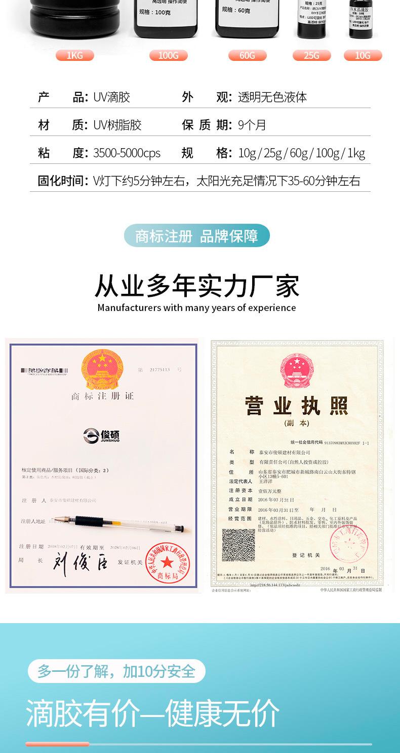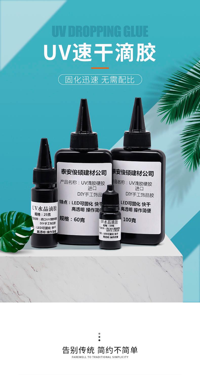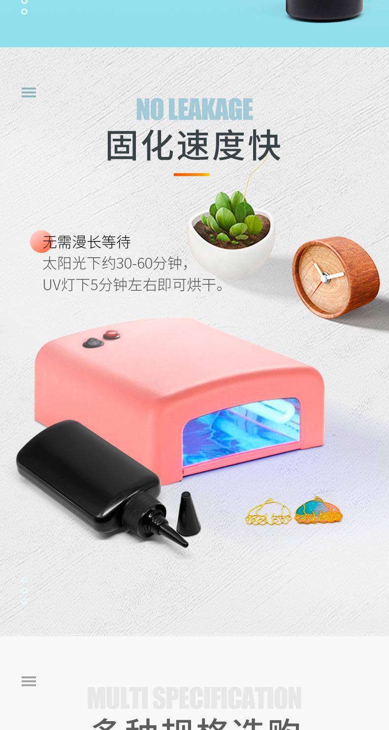 Dica: Para garantir a resistência ao amarelecimento da cola UV para joias, o tempo de secagem é relativamente lento. Recomenda-se usar uma lâmpada ultravioleta de 36 watts para secar. Pode secar em 1-2 minutos. A cola UV é geralmente adequada para peças pequenas, não adequada para peças grandes. Itens grossos. A luz natural é difícil de secar.