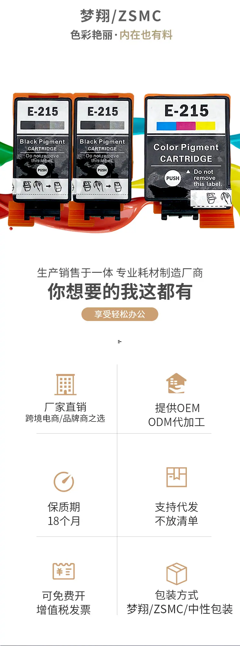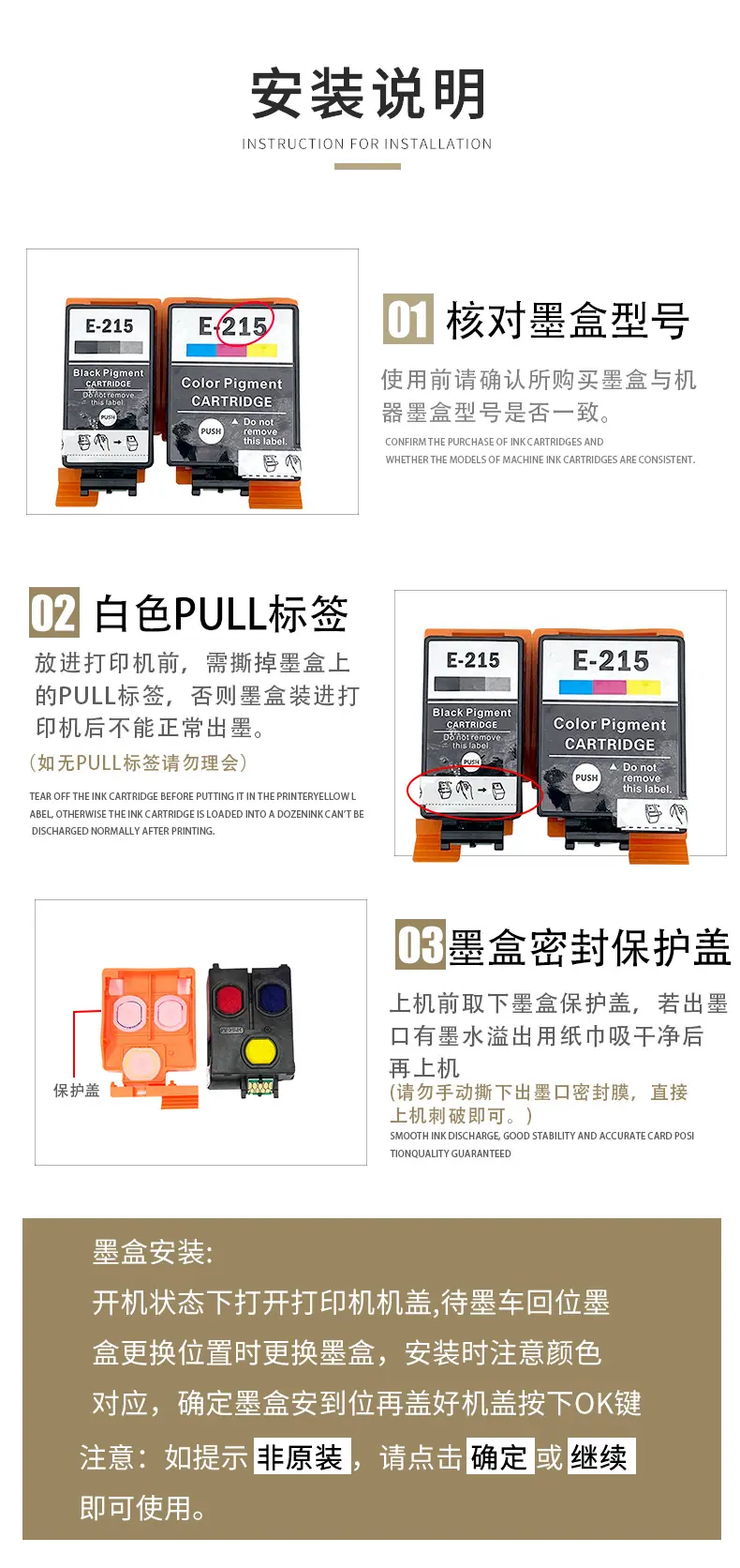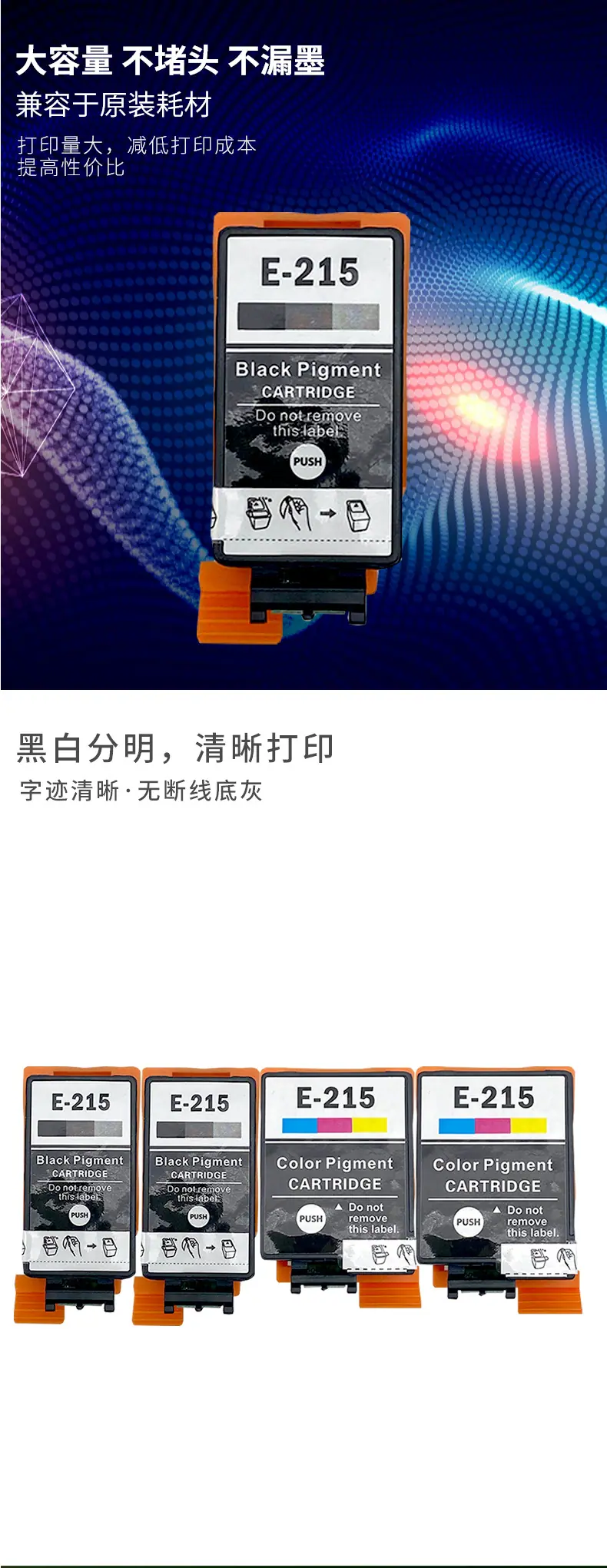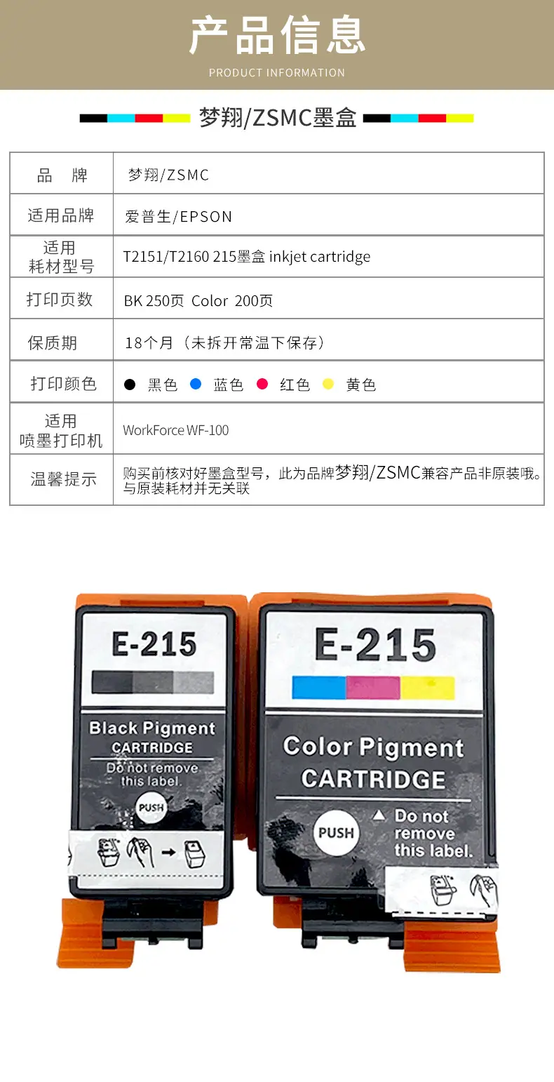 Marca: Meng Xiang Adequado para cartuchos de tinta Epson T2151 T2160 215 Modelo de Cartucho de Tinta Aplicável:Cartucho de jato de tinta T215BK T215CL Modelos aplicáveis: impressoras jato de tinta WorkForce WF100 Cor: preto, cor Capacidade de tinta: BK 11ML COR 13ML Regiões aplicáveis: América do Norte Austrália Fornece processamento OEM, grande quantidade e preço favorável. Prazo de validade: 2 anos Embalagem: saco a vácuo ou caixa colorida Pós-venda: Este produto é um consumível compatível. Caso o produto apresente problemas de qualidade, ele poderá ser devolvido ou trocado. A taxa de envio de devolução será suportada pela nossa empresa. |