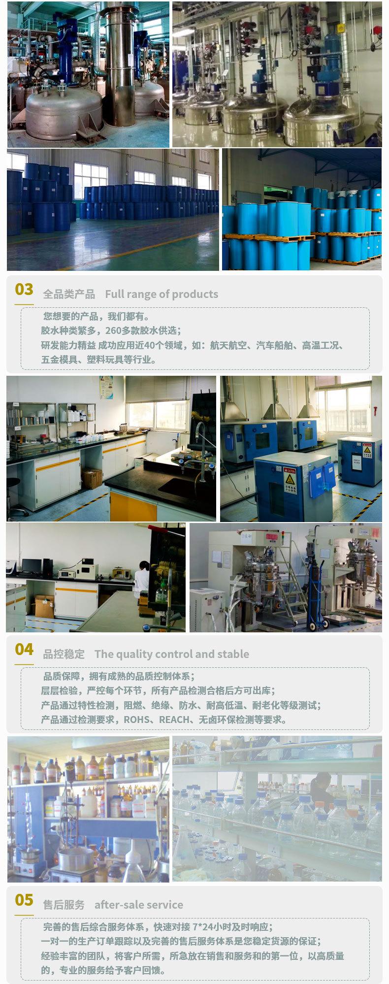 Todos os produtos da empresa são desenvolvidos e produzidos pela equipe de pesquisa para resolver os problemas de colagem relatados pelos clientes e para resolver os problemas de colagem de vários materiais. As principais séries de produtos incluem: cola eletrônica, cola para encapsulamento de componentes eletrônicos, silicone eletrônico, tinta eletrônica de três provas, adesivo de silicone orgânico, cola de revestimento, cola sem sombra, cola plástica (cola plástica que pode aderir a PP, PE, PC, PVC e outros materiais difíceis de aderir) para aplicações eletrônicas e elétricas, agente de reparo industrial, agente de reparo supermetal, cola de reparo e reparo de metal para manutenção de peças de equipamentos mecânicos, cola resistente a altas temperaturas, cola super resistente a altas temperaturas e adesivo resistente a altas temperaturas desenvolvido para condições especiais de trabalho em altas temperaturas, cola anaeróbica desenvolvida para travamento de parafusos e roscas, cola de secagem rápida, cola instantânea, cola AB azul-vermelha, cola AB de resina epóxi, cola UV sem sombra desenvolvida para os requisitos de secagem rápida de montagem industrial e agentes de tratamento de superfície desenvolvidos para tratamento de superfície de metais, PP, PVC, silicone, borracha de silicone, ligas de alumínio, etc.