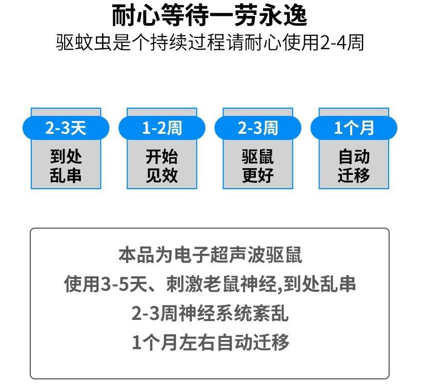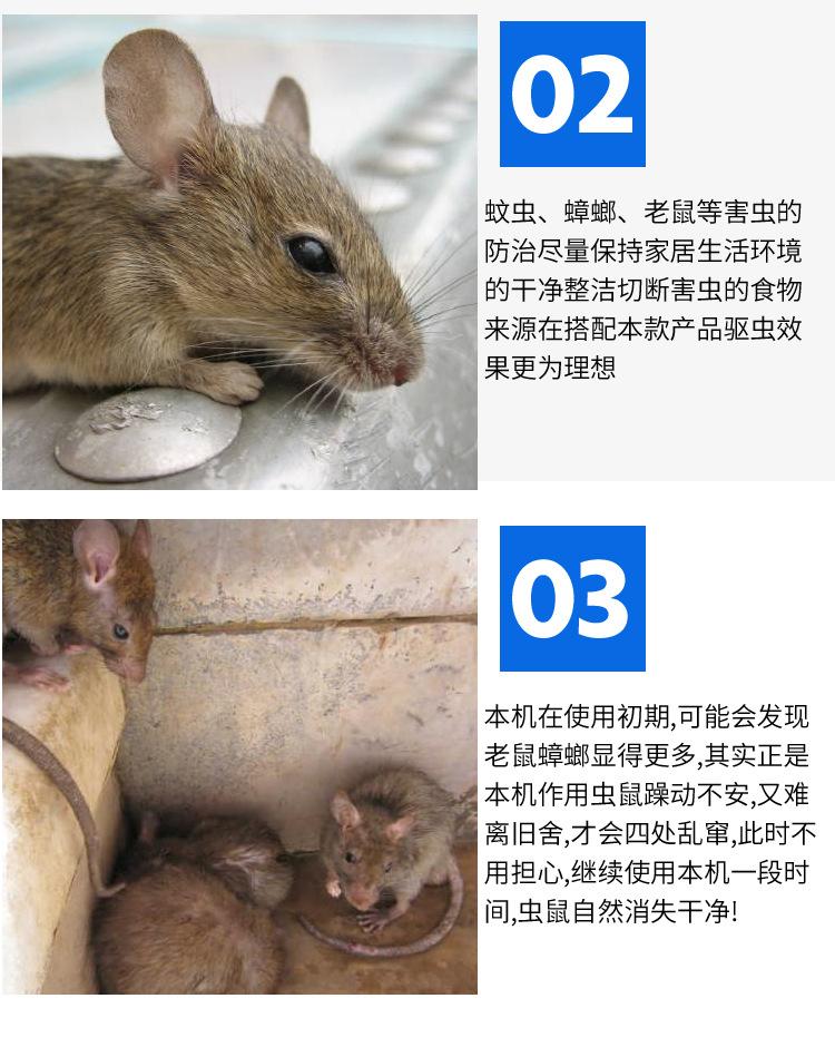 3. Se você achar que as atividades de ratos e pragas aumentam significativamente nos primeiros dias de uso, isso é um fenômeno normal. Isso ocorre porque os ratos e pragas que se escondem em seus ninhos fugirão de seus esconderijos originais após serem atacados por ondas ultrassônicas e eletromagnéticas.