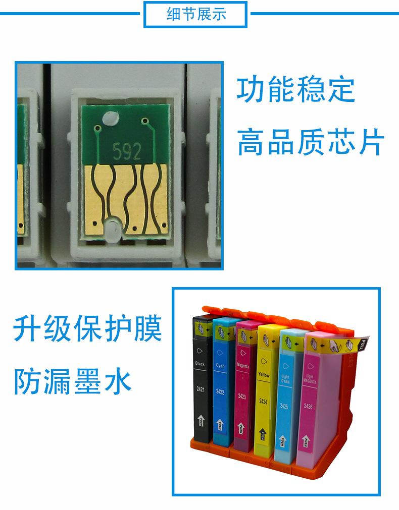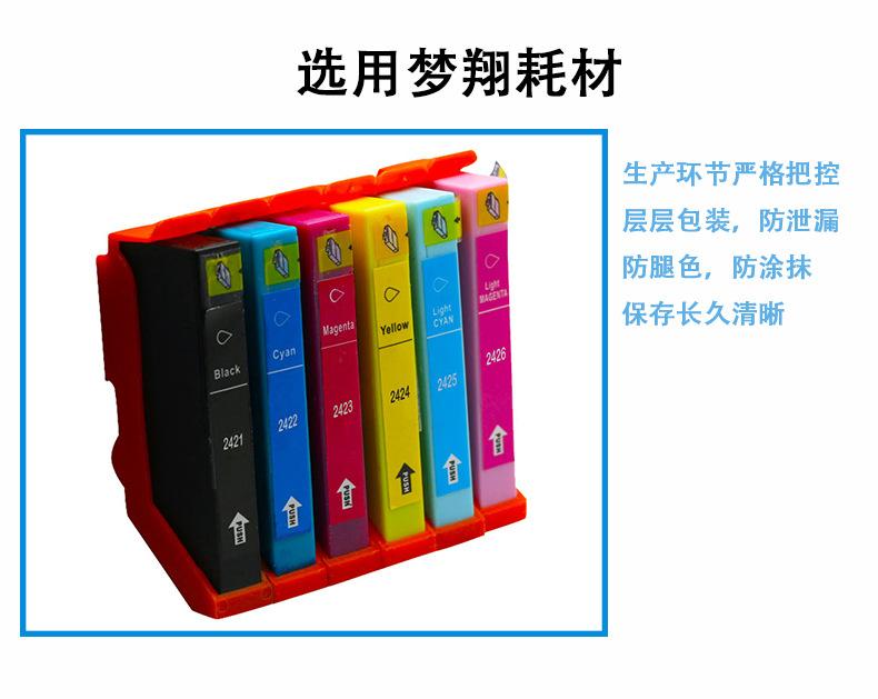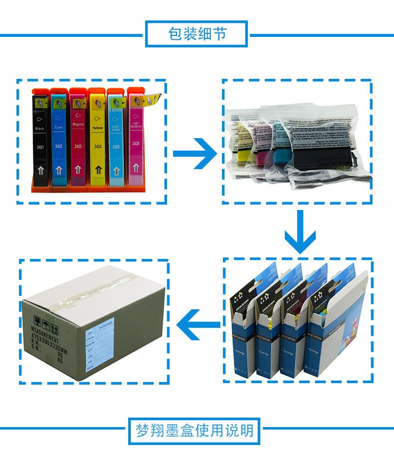 Marca: Meng Xiang Compatível com cartuchos de tinta 24XL Compatível com os modelos de cartucho de tinta: 24XL 24 T2421 T2422 T2423 T2424 T2425 T2426 Modelos de impressoras jato de tinta aplicáveis: Photo XP-750 XP-850 Cor: preto, azul, vermelho, amarelo, azul claro, vermelho claro Capacidade de tinta: 18ML por cor Fornece processamento OEM, grande quantidade e preço favorável. Prazo de validade: 2 anos Embalagem: saco a vácuo ou caixa colorida Pós-venda: Este produto é um consumível compatível. Caso o produto apresente algum problema de qualidade, ele poderá ser devolvido ou trocado. A taxa de envio de devolução será suportada pela nossa empresa.