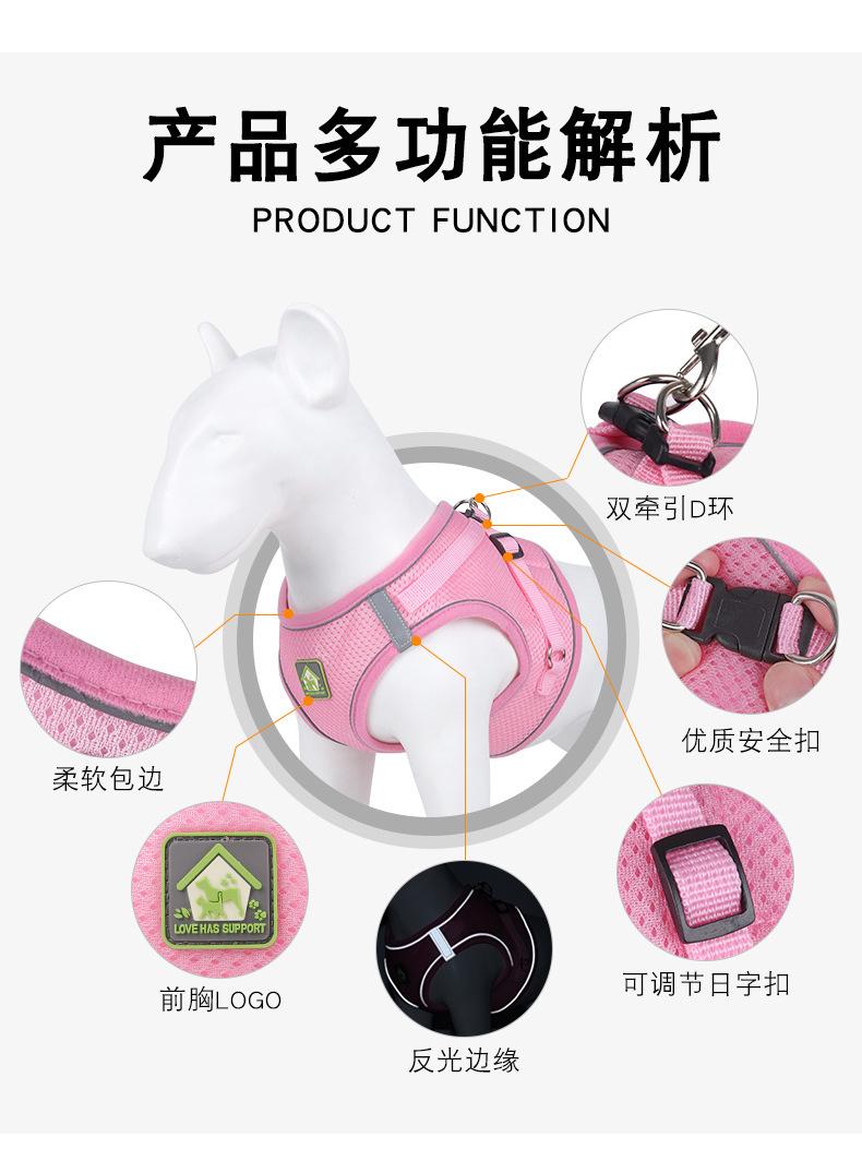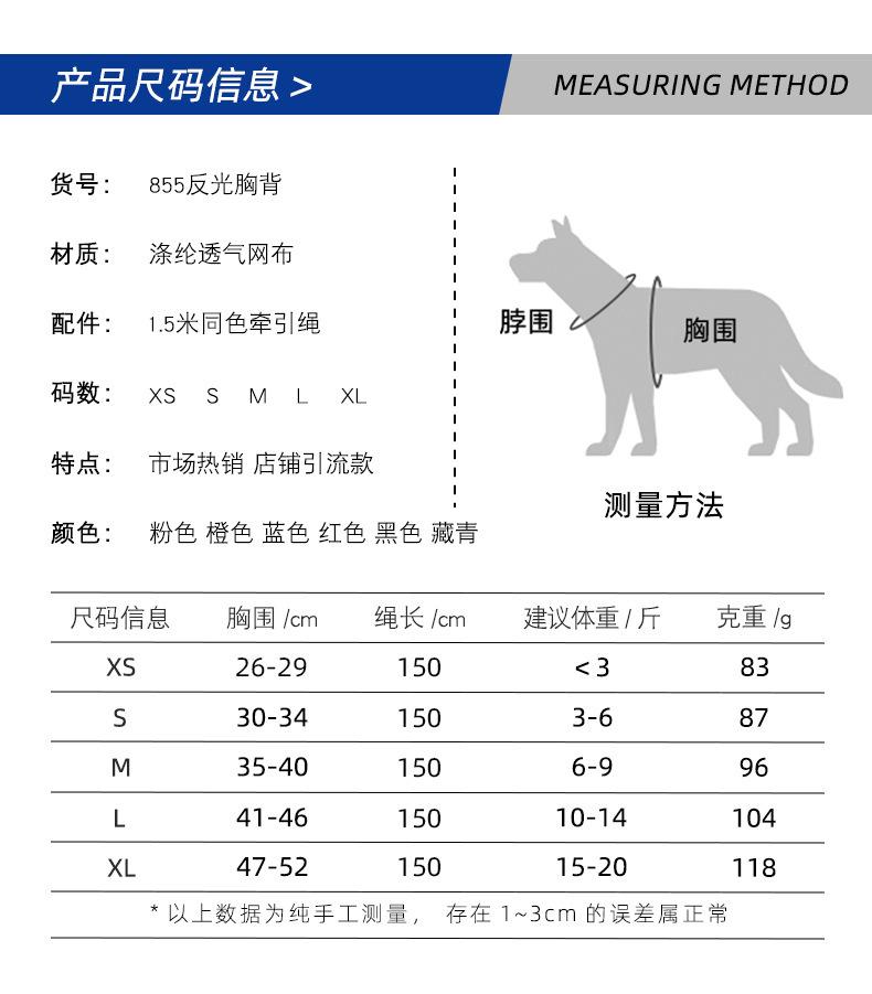 Nº do item 855 Acessórios Corda de tração de 1,5 m da mesma cor Material Malha de poliéster Cor Rosa Azul Laranja Vermelho Preto Marinho Destaques Continuação da versão popular Posicionamento Mais vendido no país e no exterior Adaptação à drenagem do mercado Tamanho Faixa de tórax/cm Peso recomendado Peso do produto/g Tamanho da embalagem Dados de especificação da caixa XS 26-29 Cerca de 3 libras 83 15*16*2 60*45*50 embalagem mista cerca de 200 por caixa S 30-34 3-6 libras 87 15*18*2 60*45*50 embalagem mista cerca de 200 por caixa M 35-40 6-9 libras 96 20*20*2 60*45*50 embalagem mista cerca de 200 por caixa L 41-46 10-14 libras 104 21*21*2 60*45*50 embalagem mista cerca de 200 por caixa XL 47-52 15-20 catties 118 26*25*2 60*45*50 Embalagem mista cerca de 200 peças por caixa