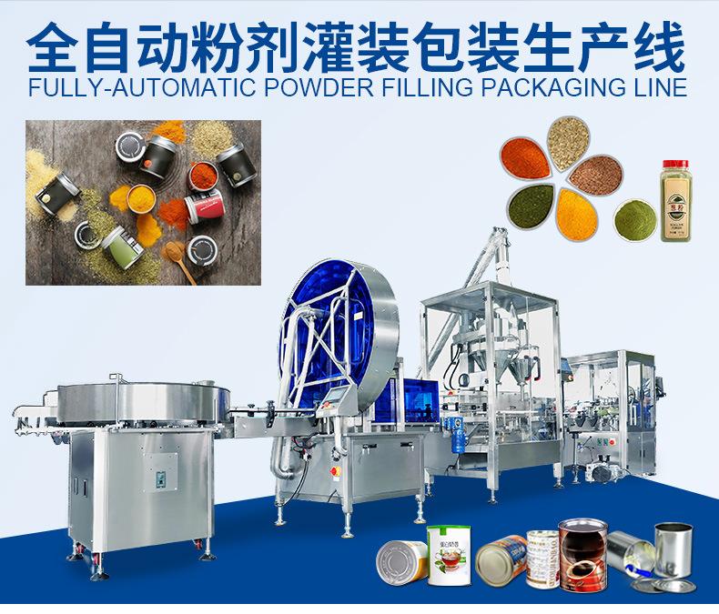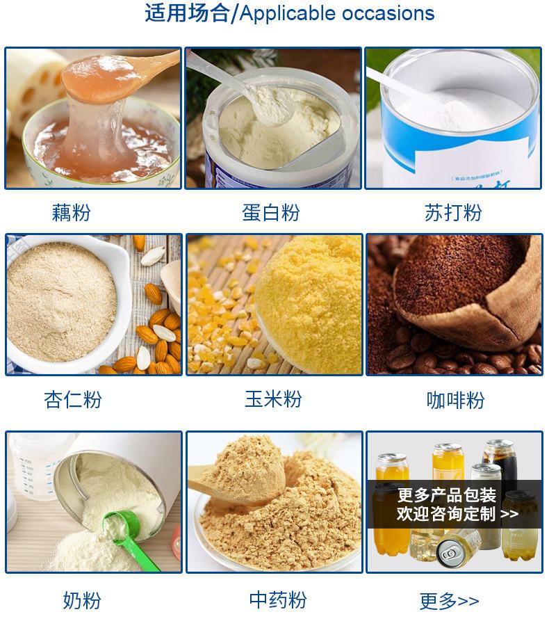 Esta linha de produção é adequada para enchimento e selagem de pó, como: leite em pó, amido de raiz de lótus, proteína em pó, pó nutricional, farinha, amido de milho, tempero em pó, tomate em pó, especiarias em pó, cebola, gengibre e alho em pó, essência, essência de frango, chá em pó, etc.; Também é adequada para uso que requer esterilização de latas vazias, vácuo e enchimento com nitrogênio!