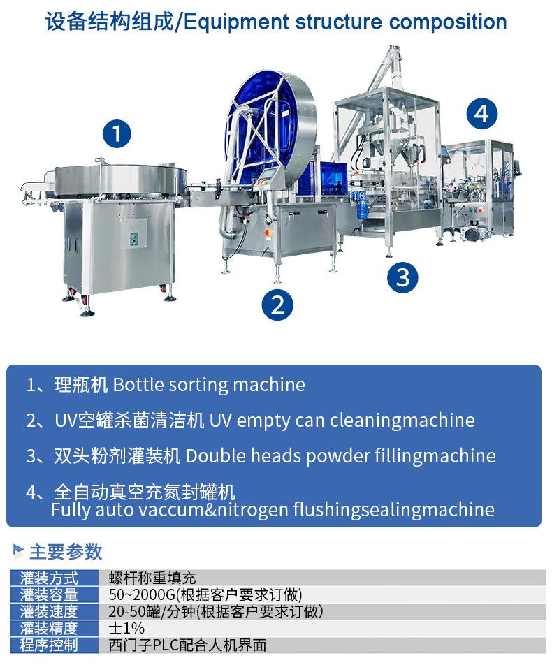 2. Máquina de limpeza de latas vazias UV Máquina de limpeza de latas vazias UV 3. Máquina de enchimento de pó de cabeça dupla