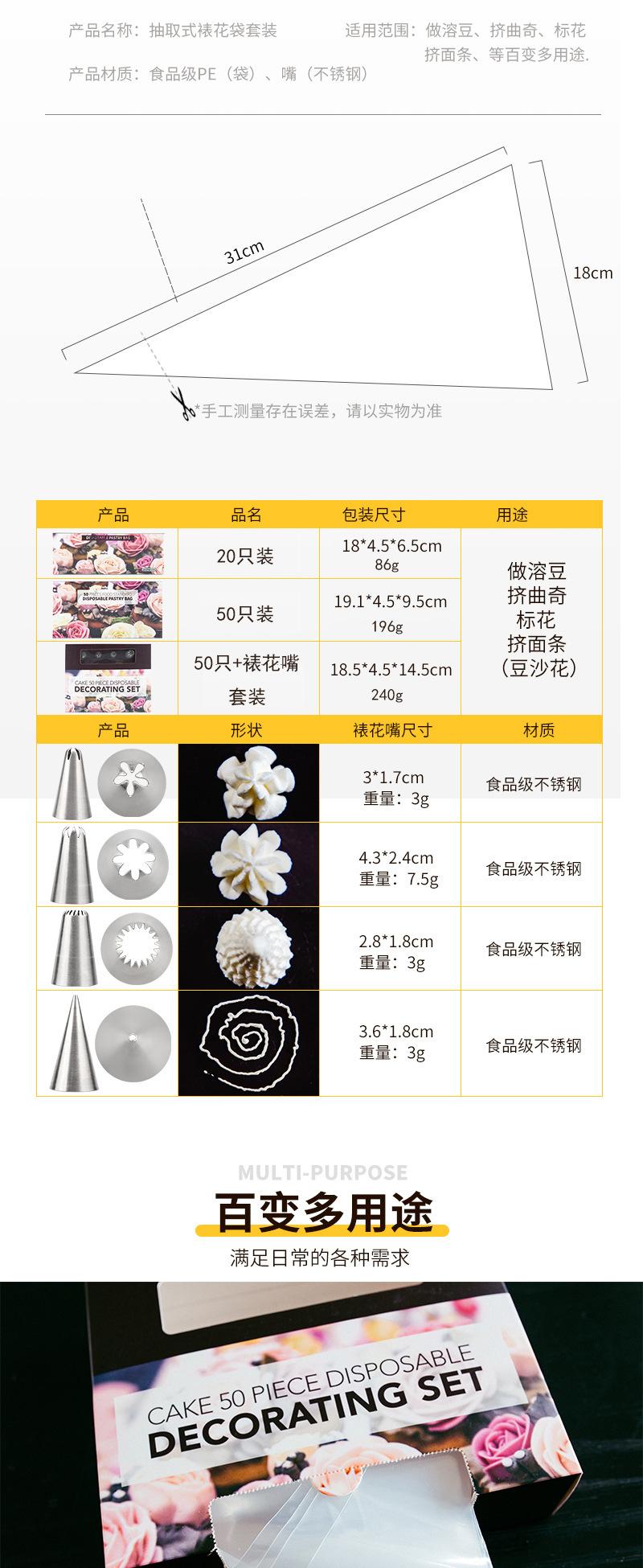 7 filamentos por un lado, 86g (paquete de 20 piezas); 196g (paquete de 50 piezas); 240g (50 piezas + boquilla para decorar)