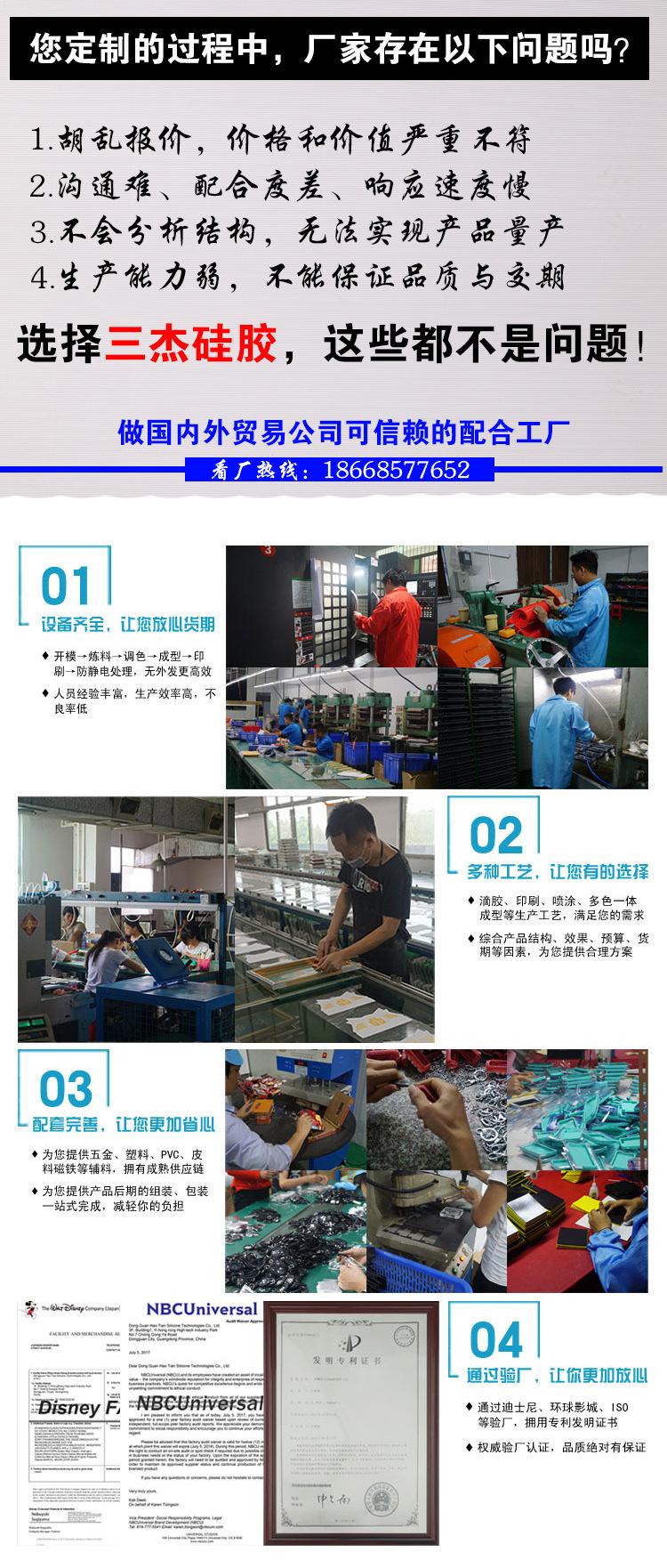 La Fábrica de Productos de Silicona Sanjie de Yuyao se encuentra en la ciudad de Moushan, ciudad de Yuyao, ciudad de Ningbo. Nuestra fábrica produce y vende principalmente artículos de uso diario de silicona, incluyendo guantes de silicona, popotes de silicona, tazas de silicona, bolsas para conservar alimentos de silicona, tapas para conservar alimentos de silicona, cubrezapatos de silicona, etc. Nuestra fábrica cuenta con equipo de producción completo y instalaciones de apoyo completas. Desde la fabricación del molde hasta el empaque, todo se completa en nuestra fábrica y no se subcontrata. 12 máquinas de moldeo de 300 toneladas, 2 máquinas de preparación de material y 2 máquinas de corte.