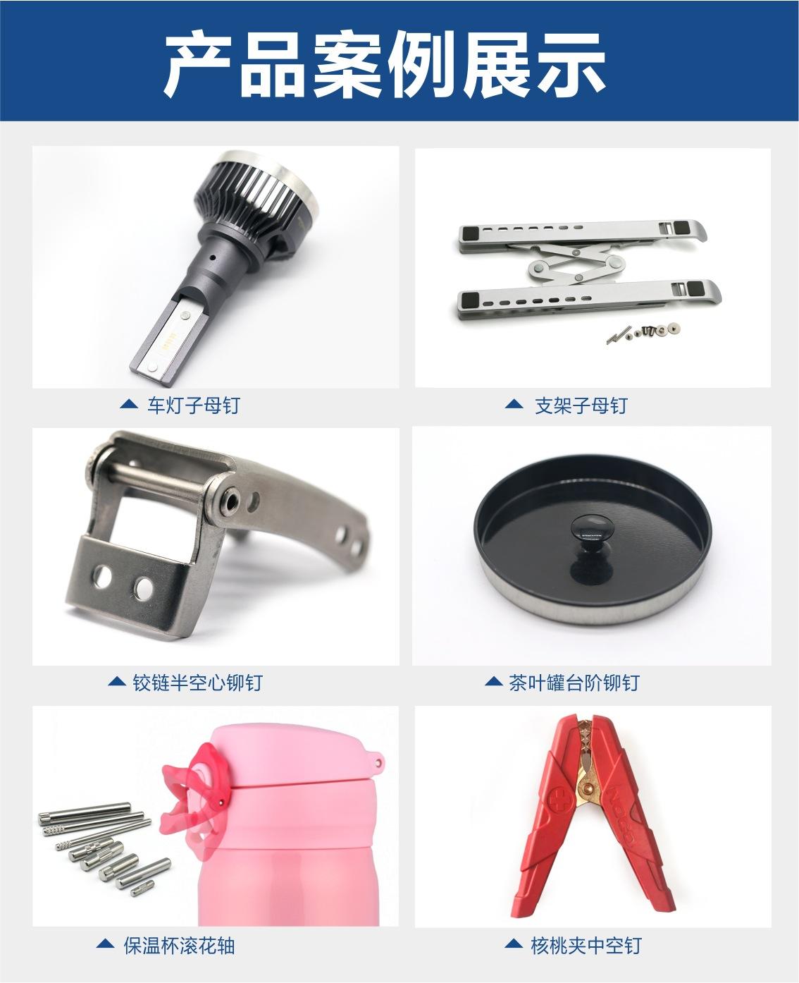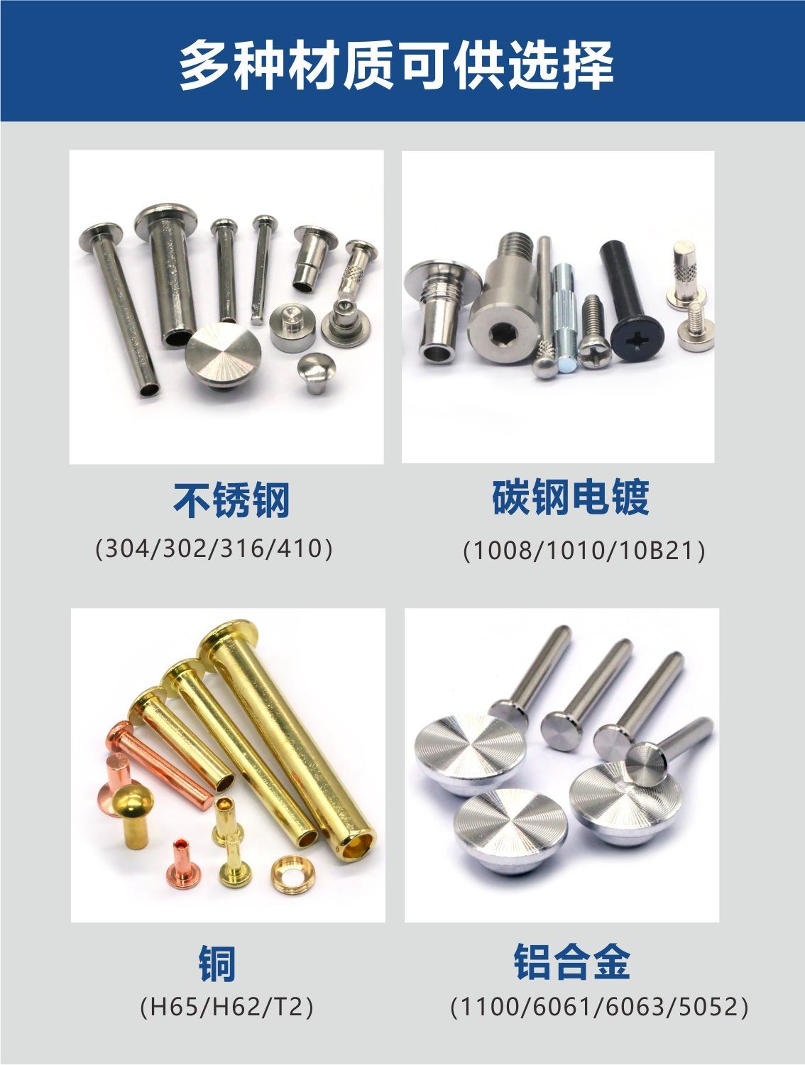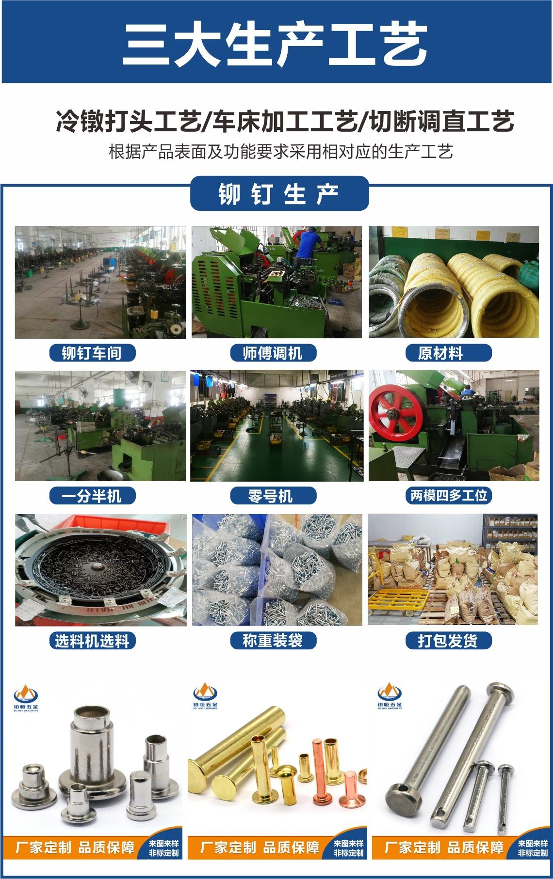 A empresa produz principalmente rebites, pinos, peças torneadas, pinos, pinos cilíndricos, pinos serrilhados, rebites escalonados e rebites mãe e filho, etc. Nós processamos e personalizamos principalmente produtos de acordo com as necessidades do cliente nas áreas de acessórios de hardware, autopeças, acessórios eletrônicos, acessórios de ferragens para portas e janelas, equipamentos mecânicos, artigos de papelaria, brinquedos, móveis, etc., e fornecemos soluções e serviços de rebitagem direcionada (rebitagem por prensa, rebitagem rotativa, etc.) para resolver as preocupações dos clientes, atender às necessidades personalizadas dos clientes e continuar a criar valor para eles.