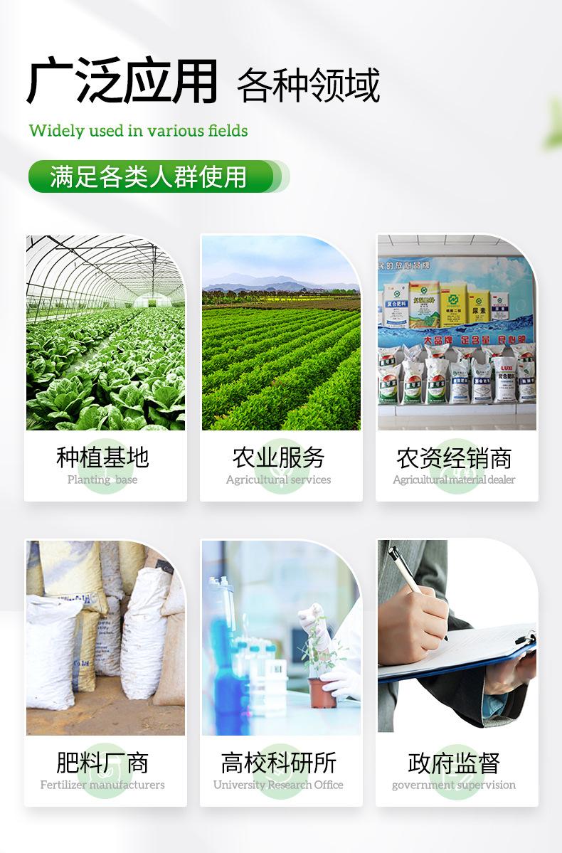 Instalações de apoio completas: Este instrumento integra medicamentos, instrumentos e instrumentos e é fácil de transportar. É equivalente a um pequeno laboratório móvel. Não exige que o usuário prepare acessórios e também pode ser usado para testes de campo flexíveis. É adequado para departamentos de serviços agrícolas ou revendedores de insumos agrícolas, cooperativas, fabricantes de fertilizantes e grandes produtores testarem o solo e fertilizarem e identificarem a autenticidade dos fertilizantes.
