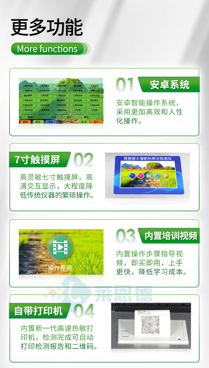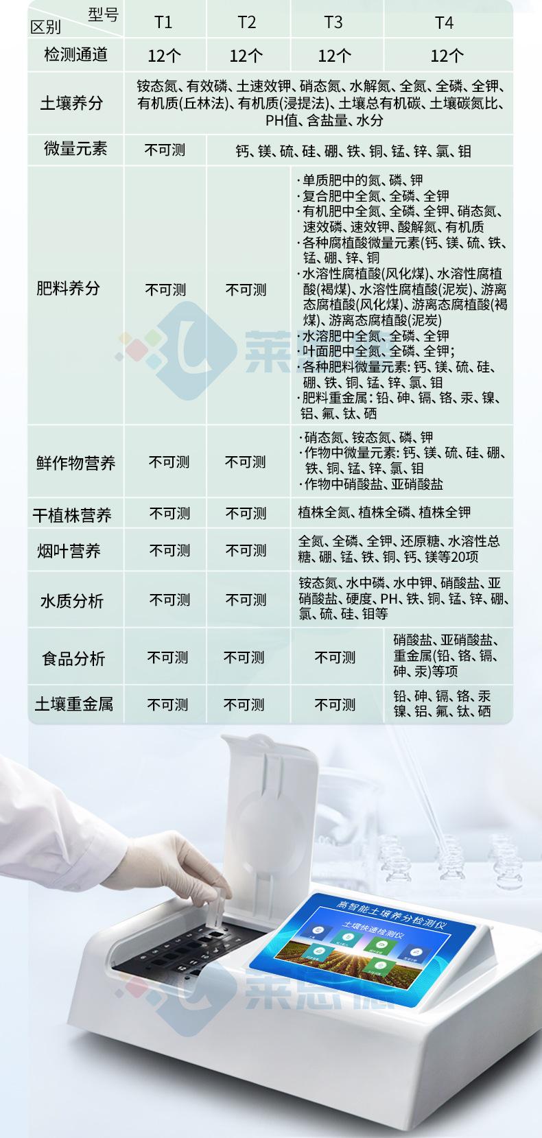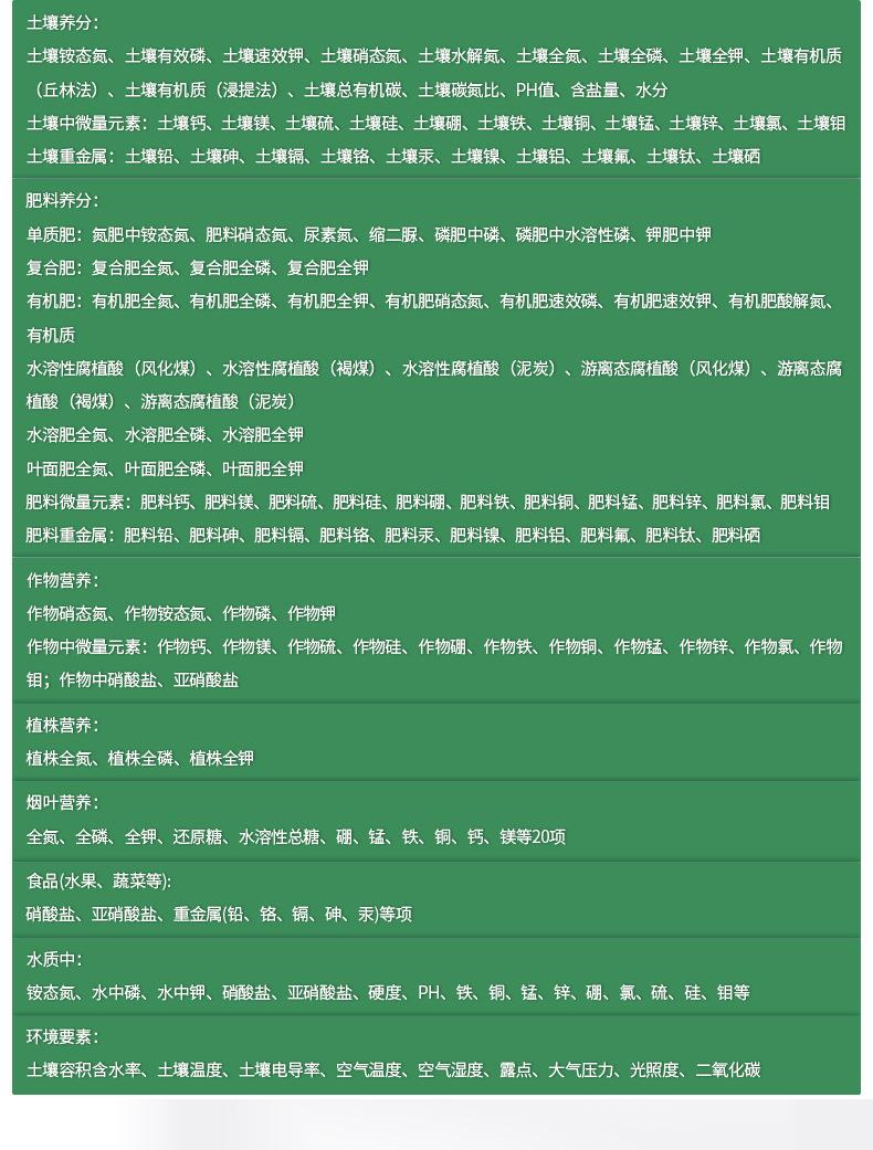 1. Nutrientes do solo: ●Nitrogênio amoniacal do solo, fósforo disponível no solo, potássio disponível no solo, nitrogênio nitrato do solo, nitrogênio hidrolisável do solo, nitrogênio total do solo, fósforo total do solo, potássio total do solo, matéria orgânica do solo (método Qiulin), matéria orgânica do solo ( método de lixiviação), valor de pH, teor de sal, umidade. ● Oligoelementos no solo: cálcio do solo, magnésio do solo, enxofre do solo, silício do solo, boro do solo, ferro do solo, cobre do solo, manganês do solo, zinco do solo, cloro do solo.
