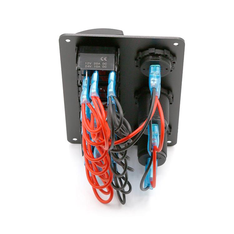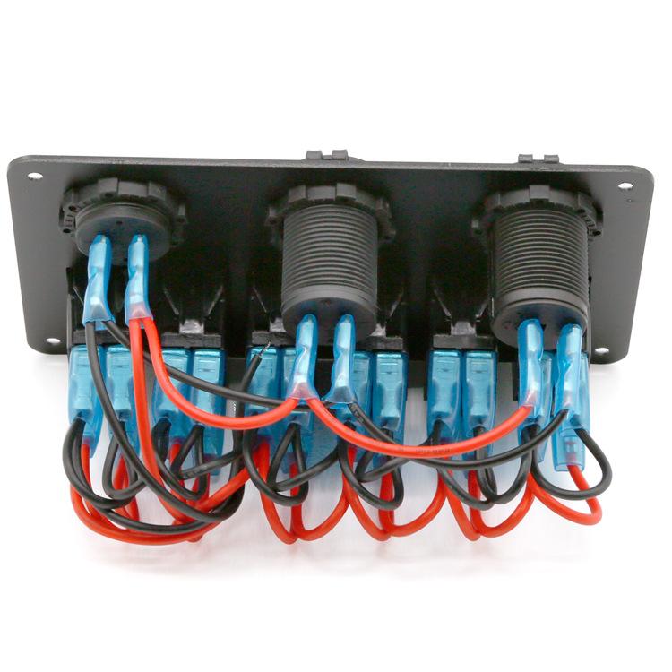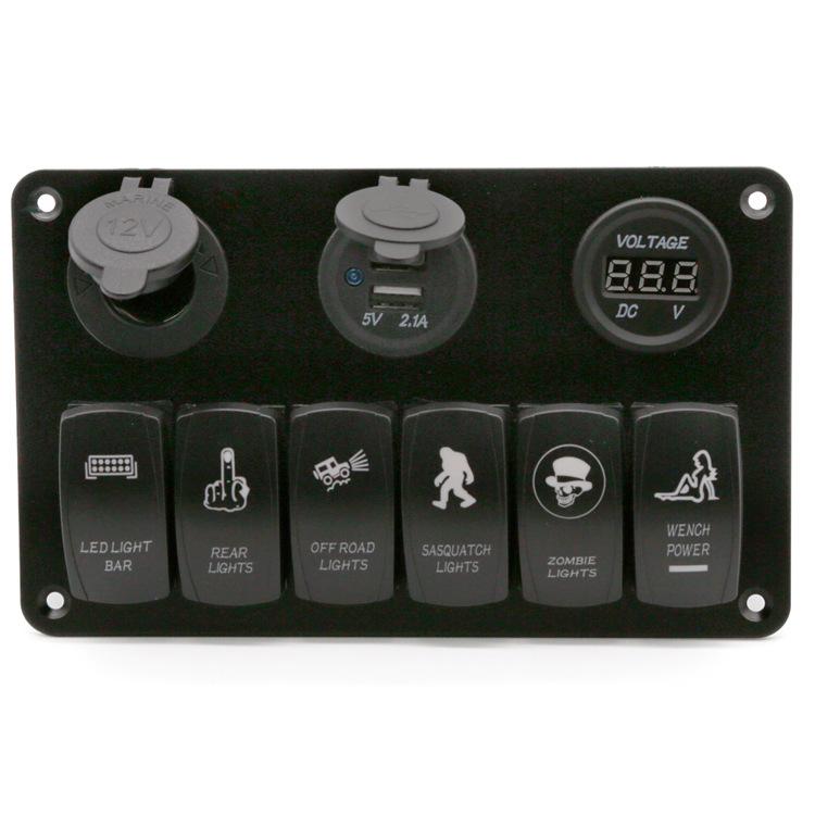 Painel de interruptores de balancim de 6 grupos de metal alumínio para carro, trailer, marinho, com carregador USB duplo + tomada de cigarro + voltímetro