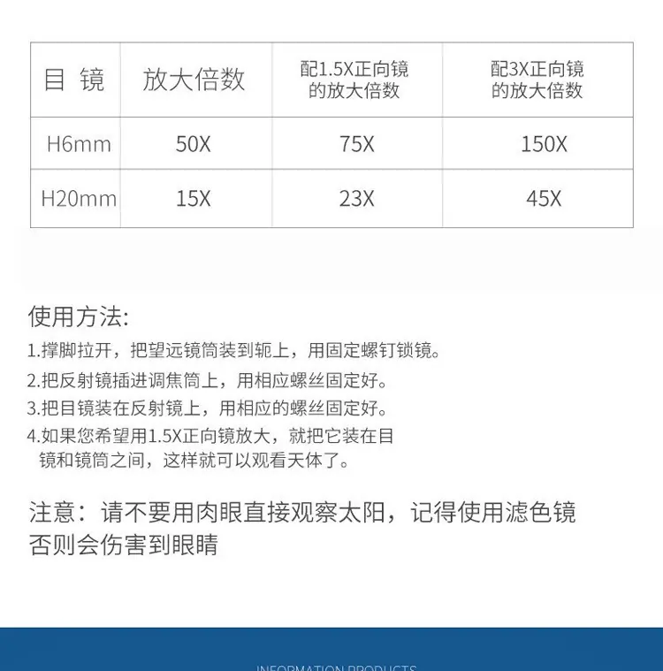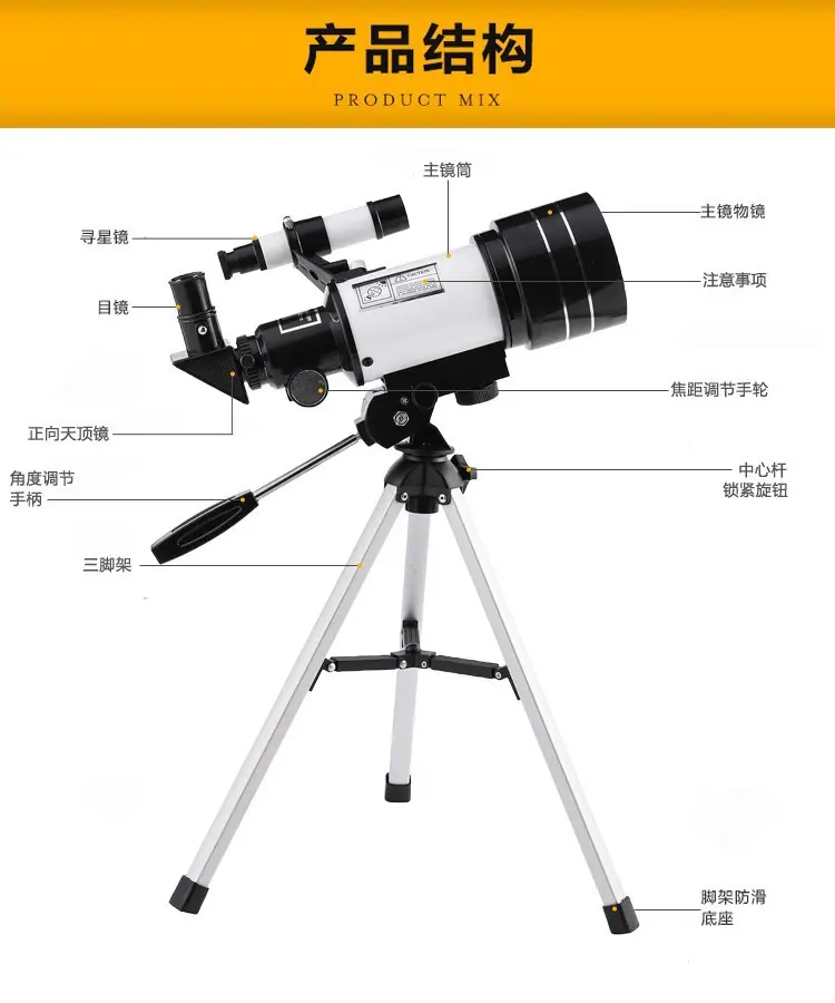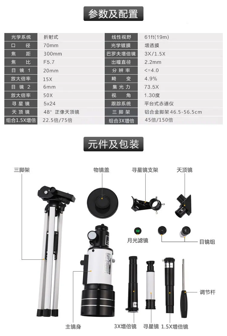 El juego completo incluye un cuerpo principal F30070M, un trípode de aleación de aluminio, oculares H20MM y H6MM cada uno, un filtro lunar, lentes Barlow 1.5X y 3X cada uno, y un manual de instrucciones.