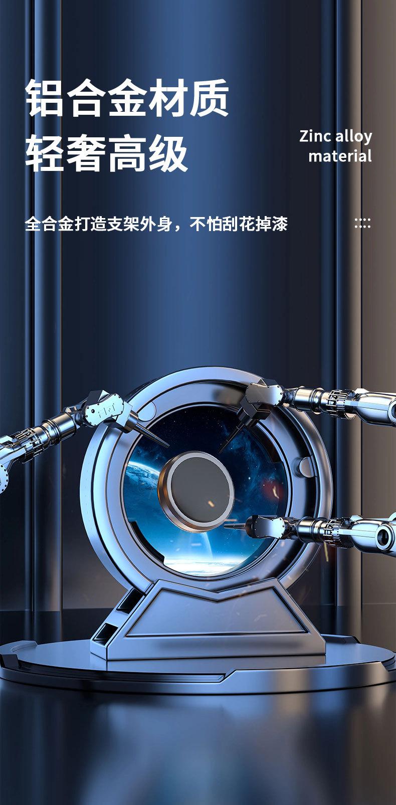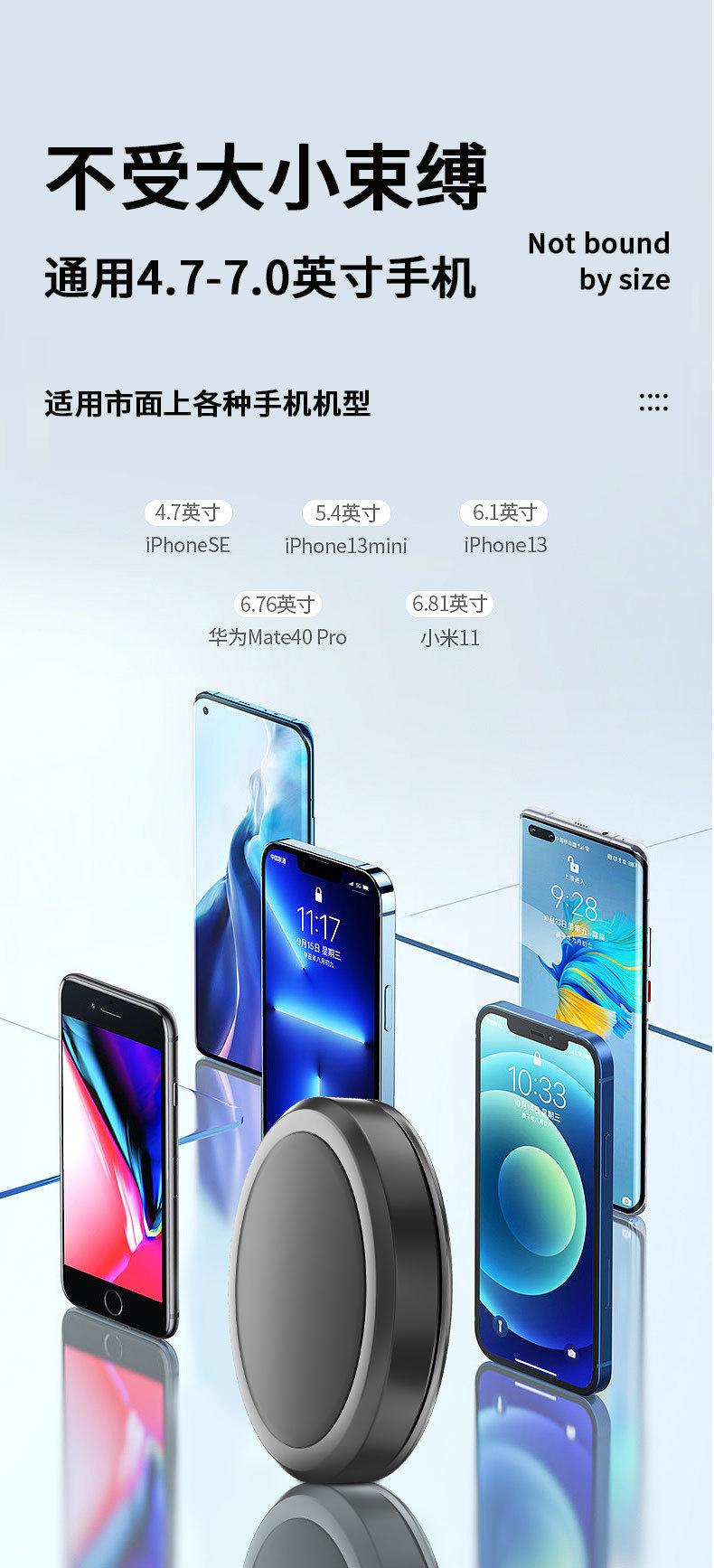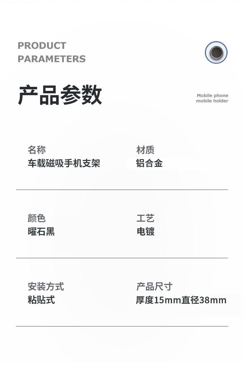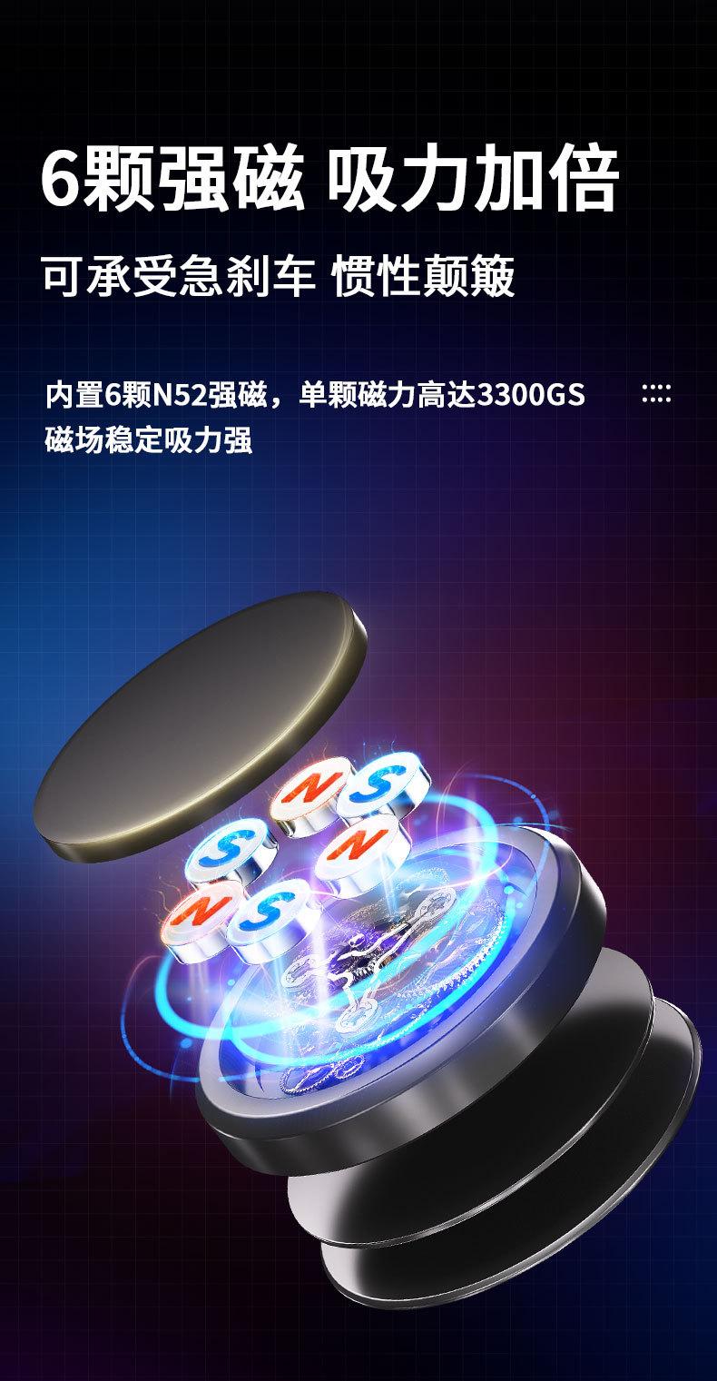 Configuração: Suporte de carro de gravidade zero, 6 ímãs fortes N52 embutidos. Observação: Padrão com 2 chapas de ferro redondas de 40MM, 1 adesivo reserva.
