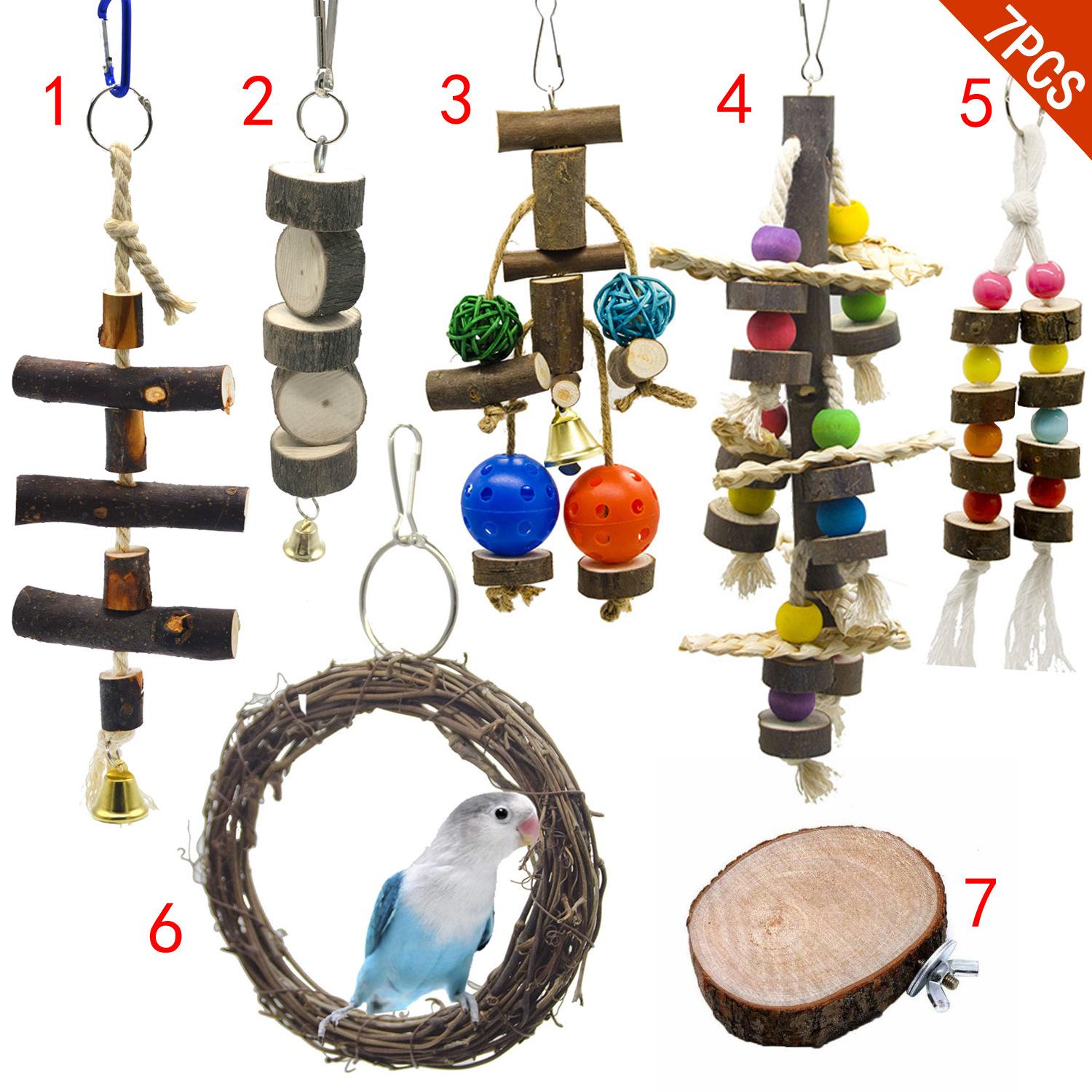 Juguete para Loro de 7 Piezas Juguete para Pájaro Madera 100% Natural con Corteza Juguete para Roer Set de Anillos Kang