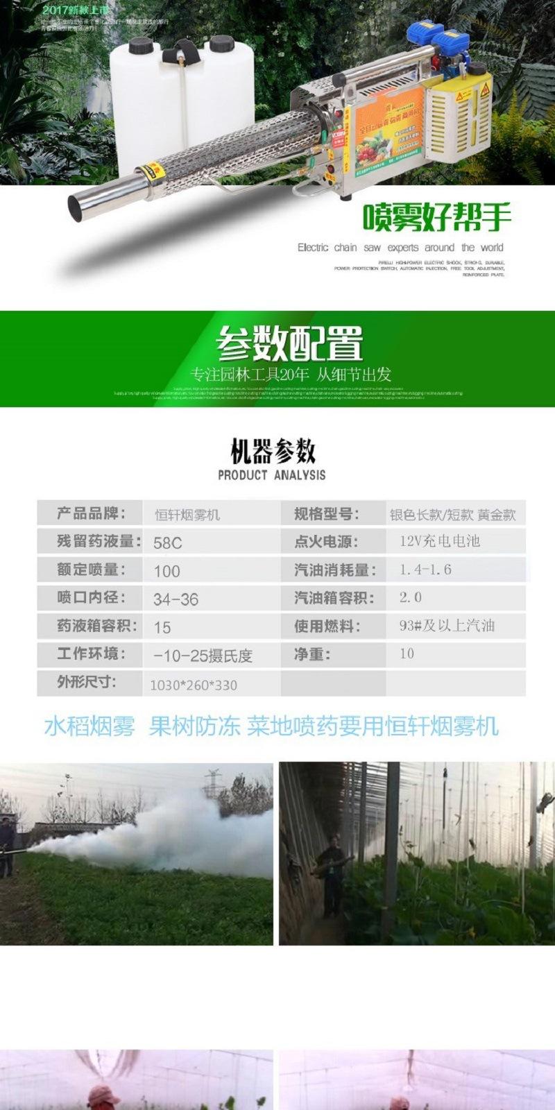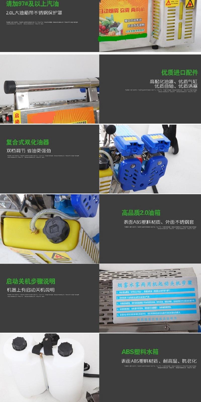 O produto é principalmente adequado para pulverização para prevenir e controlar pragas e doenças na agricultura, arroz, pomares, canteiros de flores, bases vegetais, etc. Também pode ser usado para pulverização, esterilização e desinfecção em locais públicos, lixões e criação de animais. A potência, a bomba química e a pistola de pulverização podem ser combinadas arbitrariamente para atender a diferentes níveis e necessidades de mercado. É particularmente leve e economiza mão de obra.
