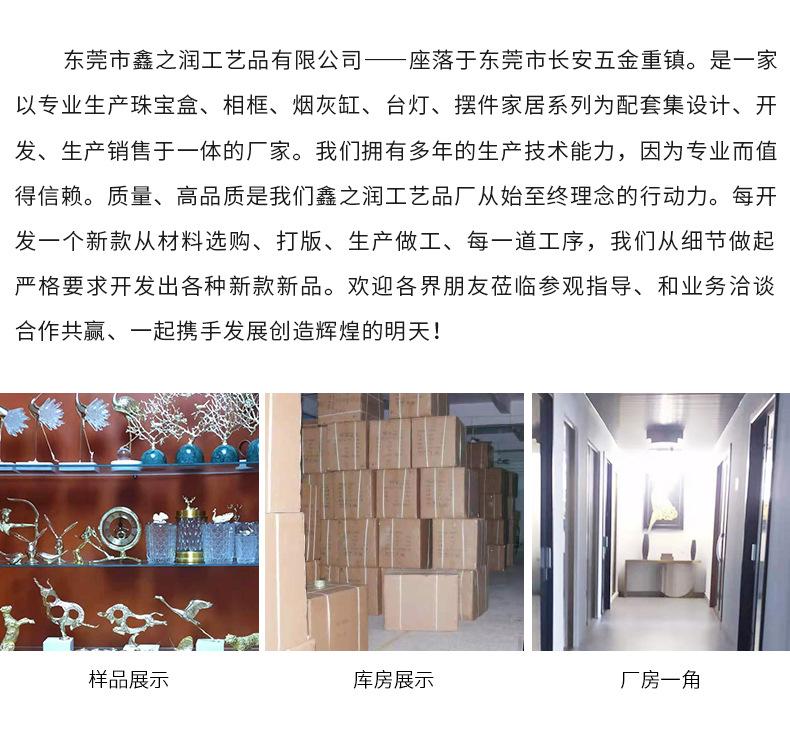 Dongguan Xinzhirun Crafts Co., Ltd. está ubicada en Chang'an, ciudad de Dongguan, un importante pueblo ferretero. Es un fabricante especializado en la producción de joyeros, marcos de fotos, ceniceros, lámparas de mesa y artículos para el hogar, integrando diseño, desarrollo, producción y ventas. Contamos con muchos años de capacidades de tecnología de producción y somos confiables debido a nuestra profesionalidad. La calidad y la alta calidad son la fuerza impulsora de la filosofía de nuestra Fábrica de Artesanías Xinzhirun de principio a fin. Cada vez que desarrollamos un nuevo estilo, desde la selección de materiales, la elaboración de patrones, la mano de obra de producción y cada proceso, partimos de los detalles y exigimos estrictamente el desarrollo de varios productos nuevos. Amigos de todos los ámbitos son bienvenidos a visitar y guiar, negociar negocios, cooperar para beneficio mutuo y trabajar juntos para crear un mañana brillante.