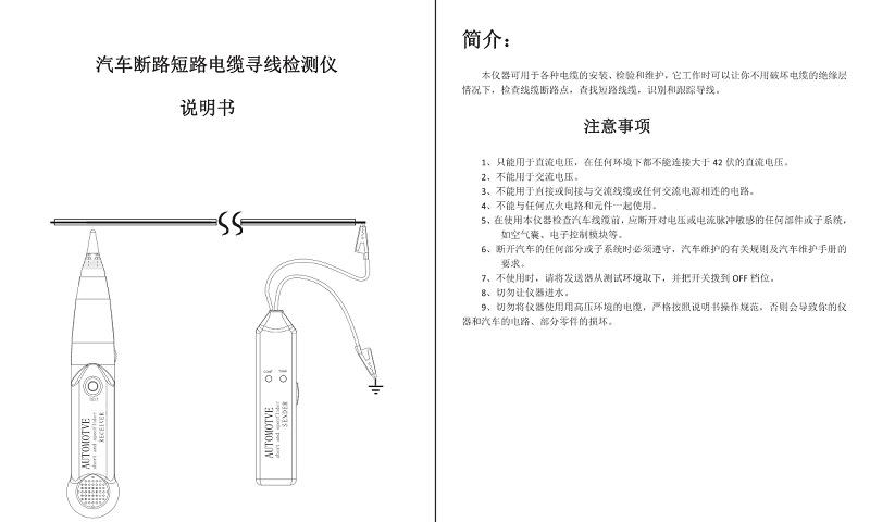 1, ligue o transmissor e o receptor e gire a chave do transmissor paraTOMposição de marcha, neste momento o transmissorTOMA luz indicadora pisca em vermelho. Ligue o receptor, gire o botão do receptor para a posição intermediária, pressione e segure o botão "Teste" e passe lentamente o receptor sobre os cabos, tubos, etc. Certifique-se de que o ponto de detecção do receptor esteja o mais próximo possível da vertical detecção acima e abaixo do cabo. Rastreie e verifique o cabo em diferentes locais, desde o ponto inicial do transmissor até a carga.(Peças, luzes, etc.)Mover. Observe a posição da sonda conforme descrito acima e continue esta etapa. Quando há um som uniforme, indica que o cabo está normal. Se o som diminuir ou parar, significa que a sonda passou por um cabo danificado, ou passou por uma ruptura, desconexão ou ponto de conexão danificado no circuito.(Este recurso é usado pelo transmissorTOMCoopere com o teste do receptor, adequado para testar quando as duas extremidades do circuito alvo não estão juntas)。