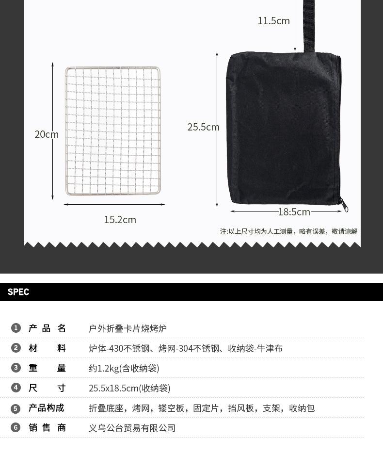Material: Cuerpo del horno: acero inoxidable 430, parrilla: acero inoxidable 304, bolsa de almacenamiento: tela Oxford