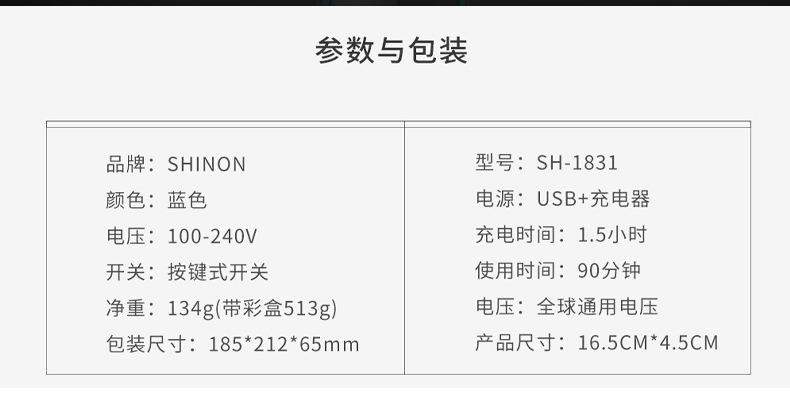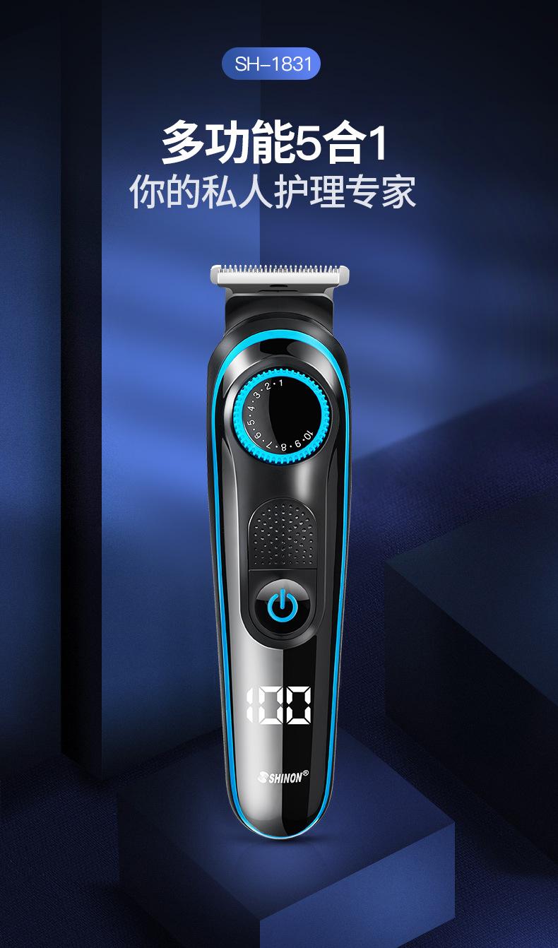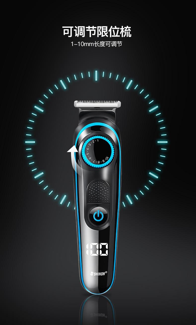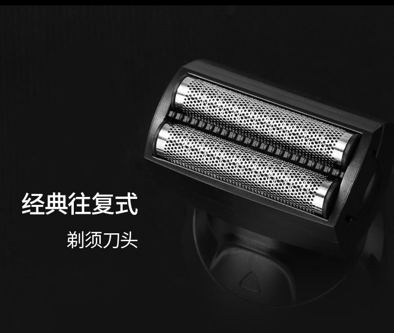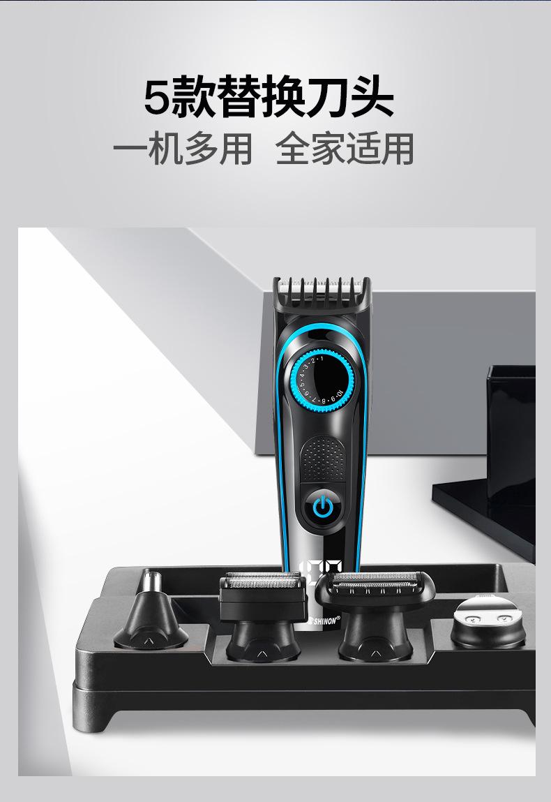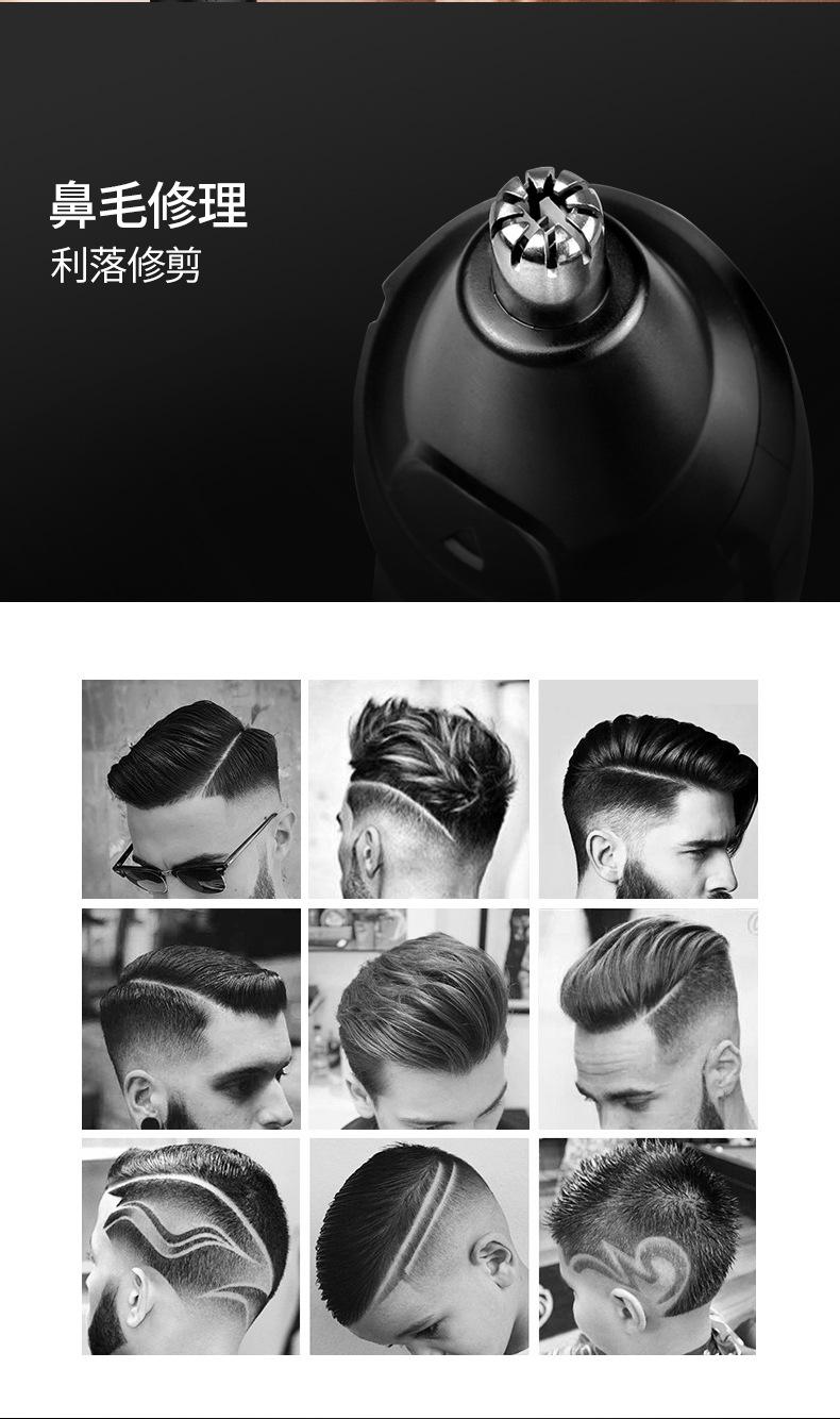 Acessórios do produto: host + cabeça de corte de cabelo + cabeça de escultura + aparador de pelos do nariz + cabeça de costeletas + cabeça de barbear + manual em inglês + cabo de carregamento USB + escova de limpeza.