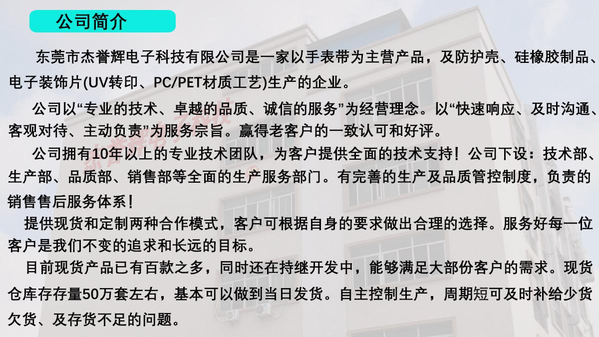 Dongguan Jieyuhui Electronic Technology Co., Ltd. es un fabricante profesional de correas para relojes inteligentes, accesorios para fundas protectoras, productos de caucho de silicona, productos de transferencia UV y otros productos de plástico y silicona. La empresa tiene como filosofía empresarial la "excelente calidad, la profesionalidad y el servicio honesto", y como principio de servicio la "rápida respuesta, la comunicación oportuna, el procesamiento objetivo, la actitud proactiva y la responsabilidad". Se ha ganado el reconocimiento y la confianza de sus clientes.