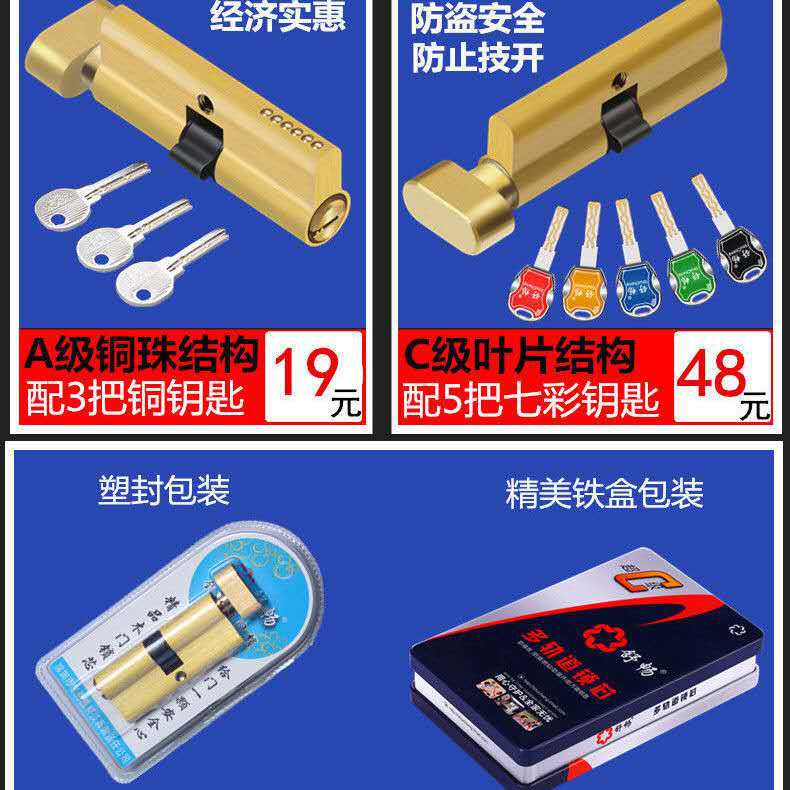 Este modelo cuenta con un pequeño cilindro de bloqueo 70 todo de cobre, 3 llaves de una pieza todo de cobre, empaque blíster, y una carcasa de bloqueo, núcleo de bloqueo y cabeza de perilla todo de cobre.