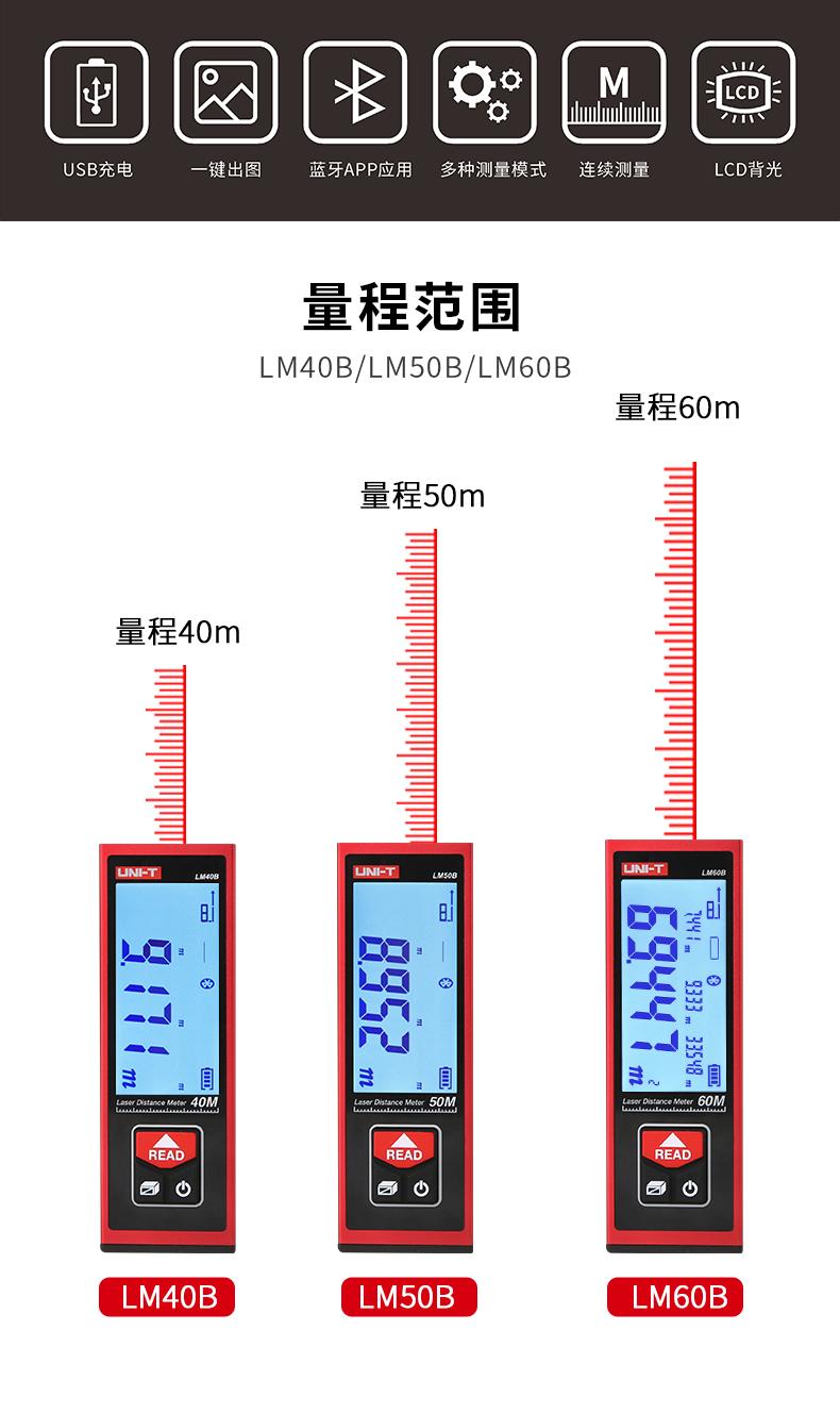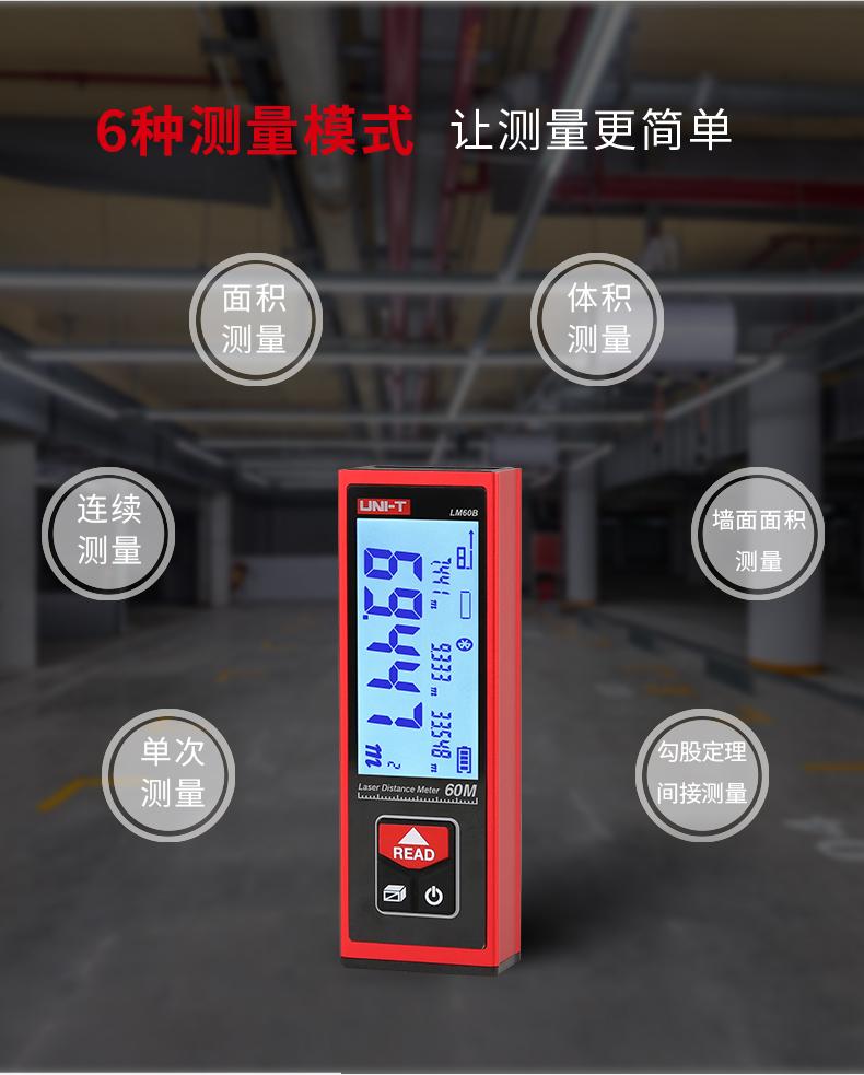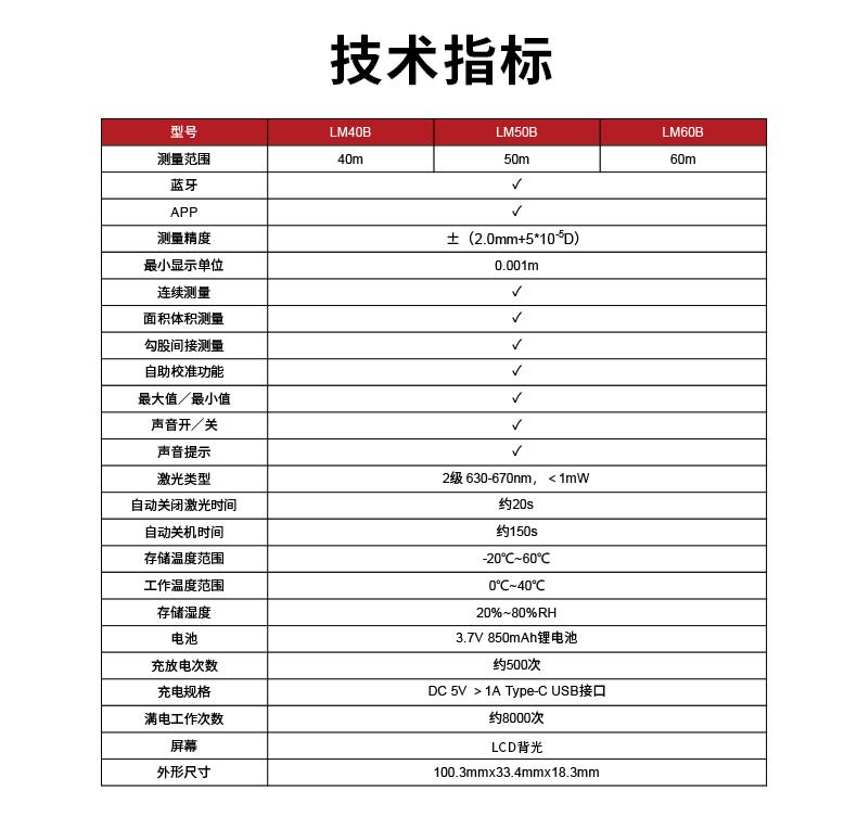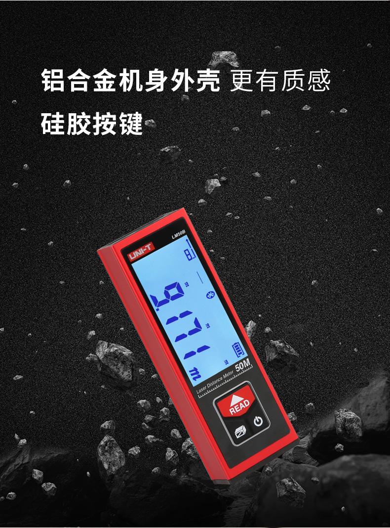 O medidor de distância a laser LM50B tem múltiplas funções práticas de medição, como medição única, medição contínua, medição de área de parede, medição de área, medição de volume, medição indireta do teorema de Pitágoras, que pode facilmente cobrir várias necessidades de medição em sua vida. Com o módulo de transmissão de dados Bluetooth, os dados podem ser transmitidos para o telefone celular a qualquer momento, então tudo está sob controle.