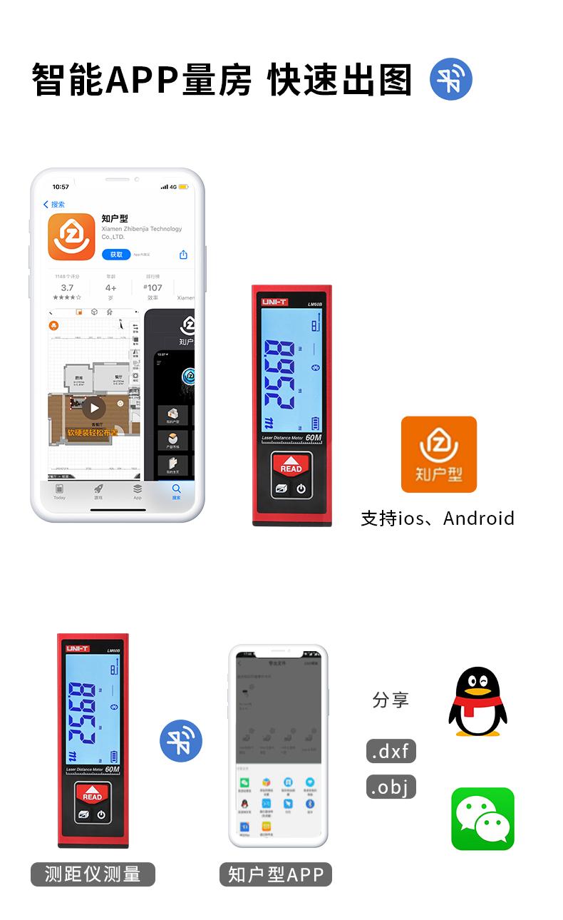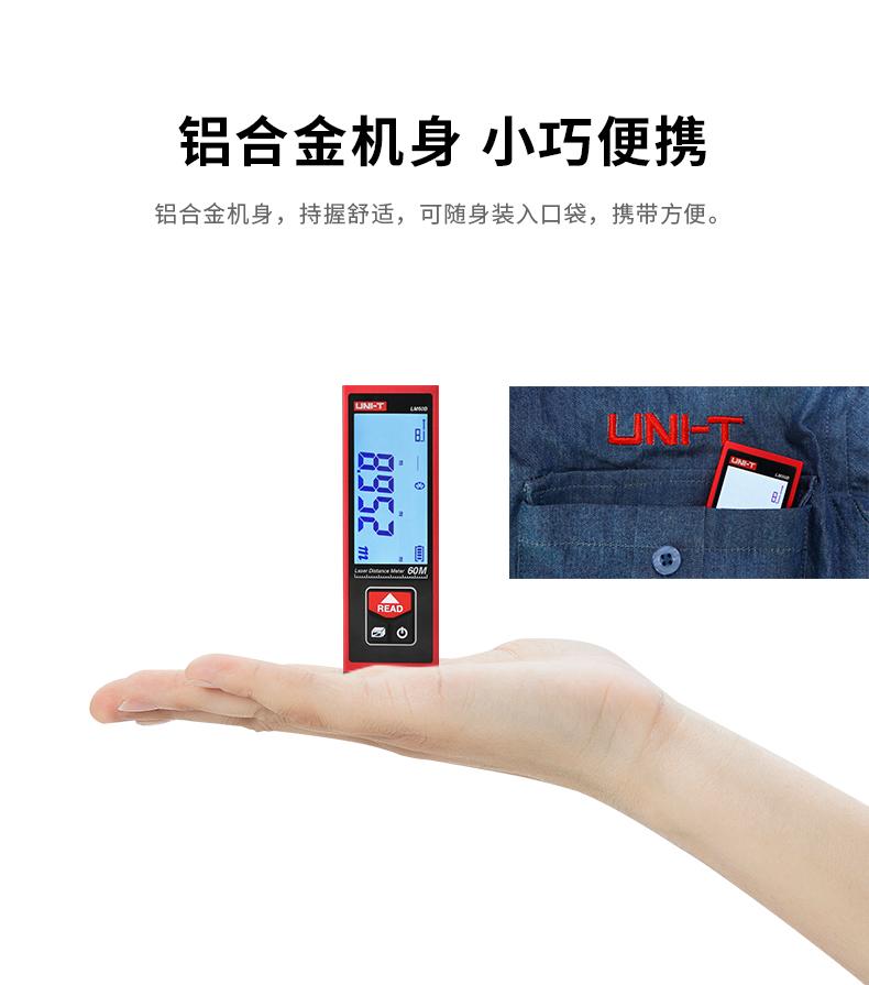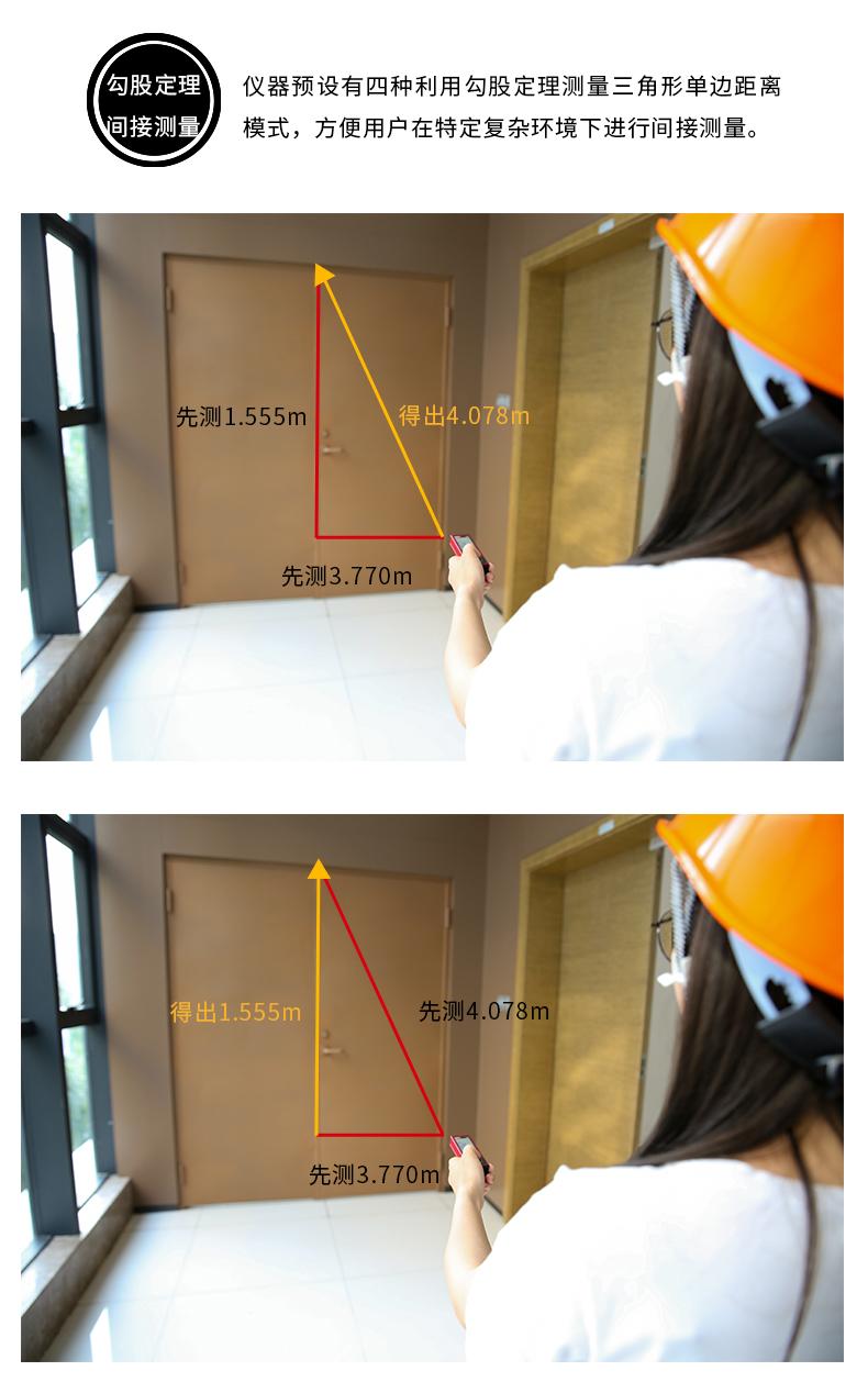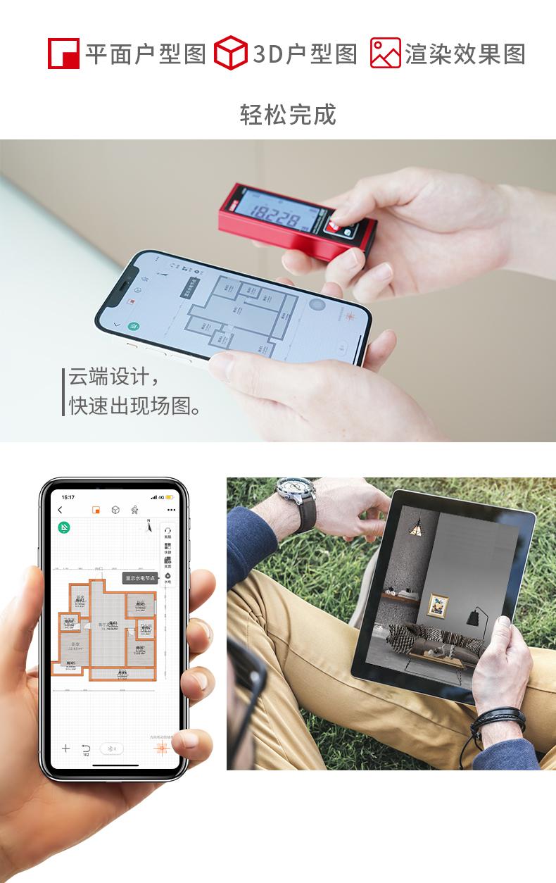 O medidor de distância a laser LM50B tem múltiplas funções práticas de medição, como medição única, medição contínua, medição de área de parede, medição de área, medição de volume, medição indireta do teorema de Pitágoras, que pode facilmente cobrir várias necessidades de medição em sua vida. Com o módulo de transmissão de dados Bluetooth, os dados podem ser transmitidos para o telefone celular a qualquer momento, então tudo está sob controle.
