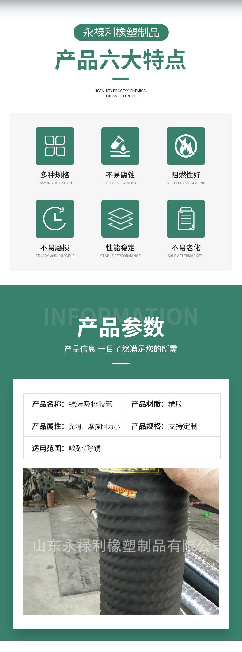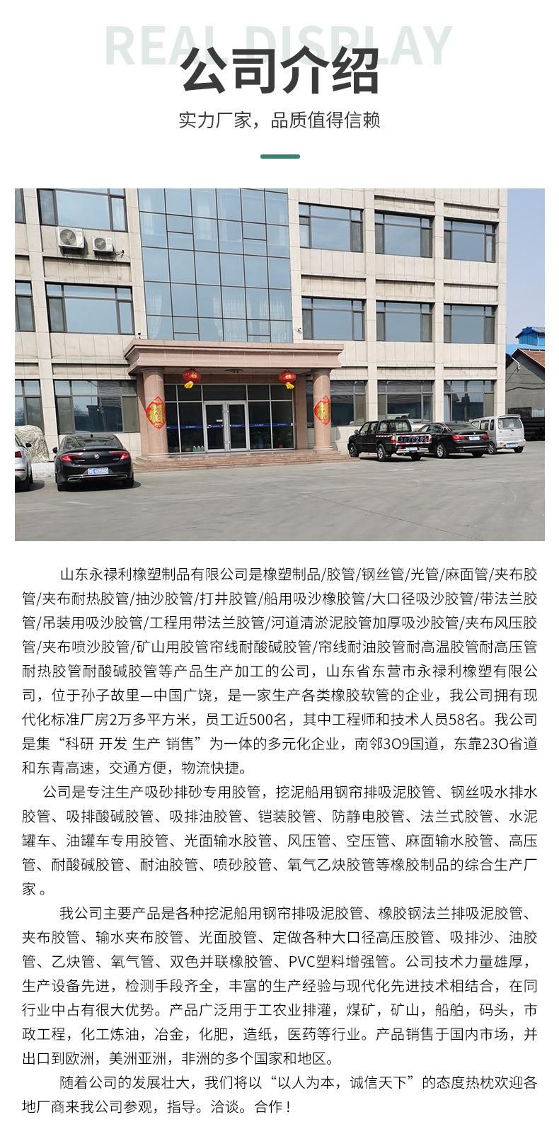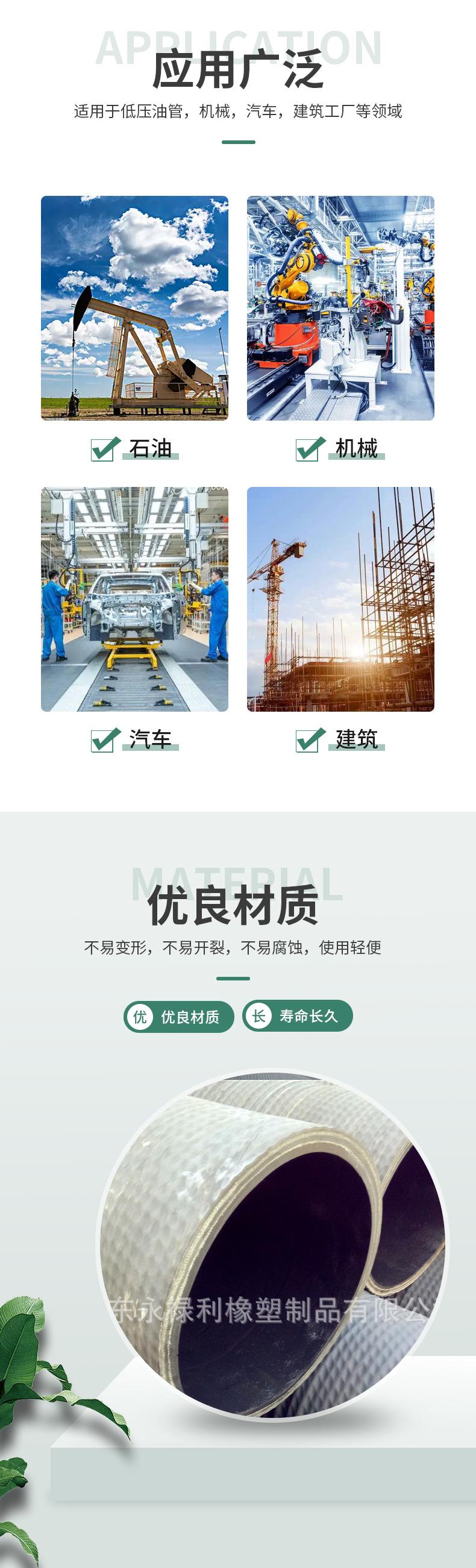 Esta série de produtos inclui:absorver água,absorver óleo,Absorção de ácido,Sucção e drenagem de areiaOutras variedades,Capaz de suportar pressões positivas e negativas,Transporte de líquido neutro à temperatura ambiente,Solução diluída de ácido e álcali.óleo.A qualidade do produto atendeHG2184-91,GB1186,GH/Y3083,HG/T2183,HG/T3036-1999,HG/T2192padrão.Aplicável a empresas industriais e de mineração,Irrigação e Drenagem Agrícola,Depósito de petróleo,Engenharia de construção e navio de dragagem que transporta lodo,Componentes de suporte da máquina de sucção de grãos, caminhão de saneamento que bombeia esgoto e fezes。
