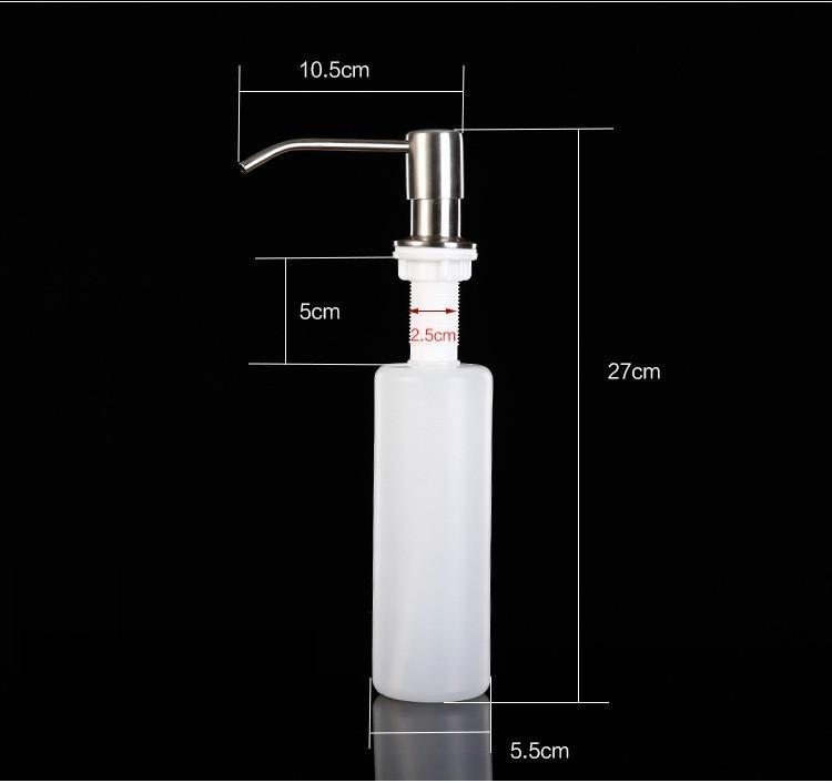 O dispensador de sabão é feito de cabeçote de pressão de aço inoxidável 304 (superfície pintada) + corpo da garrafa de material PP (capacidade de 300 ml) e novo material ABS, e é compatível com aberturas de pia de 25 mm a 36 mm.